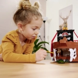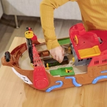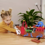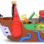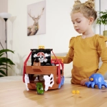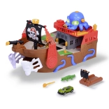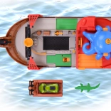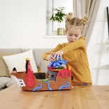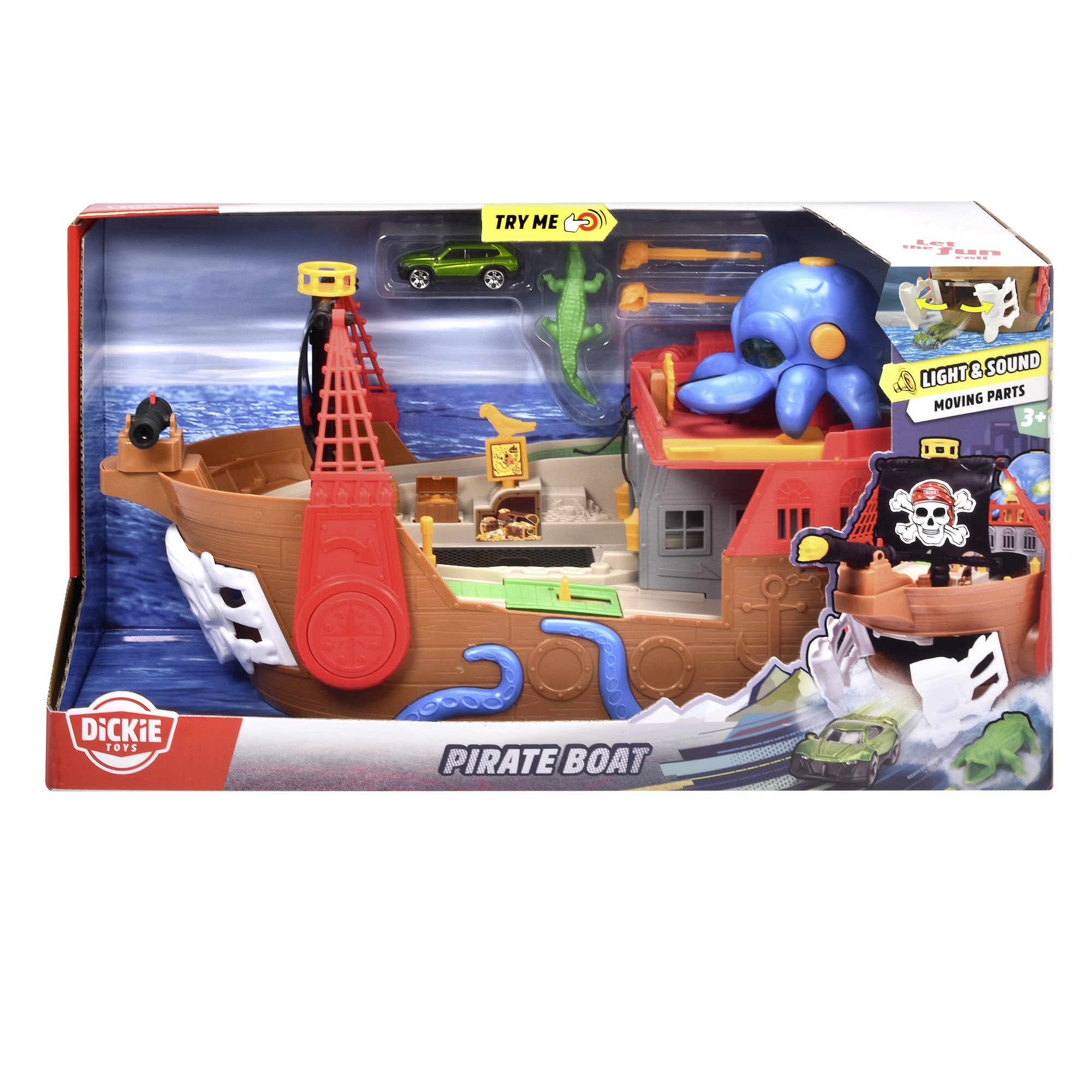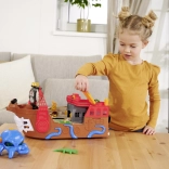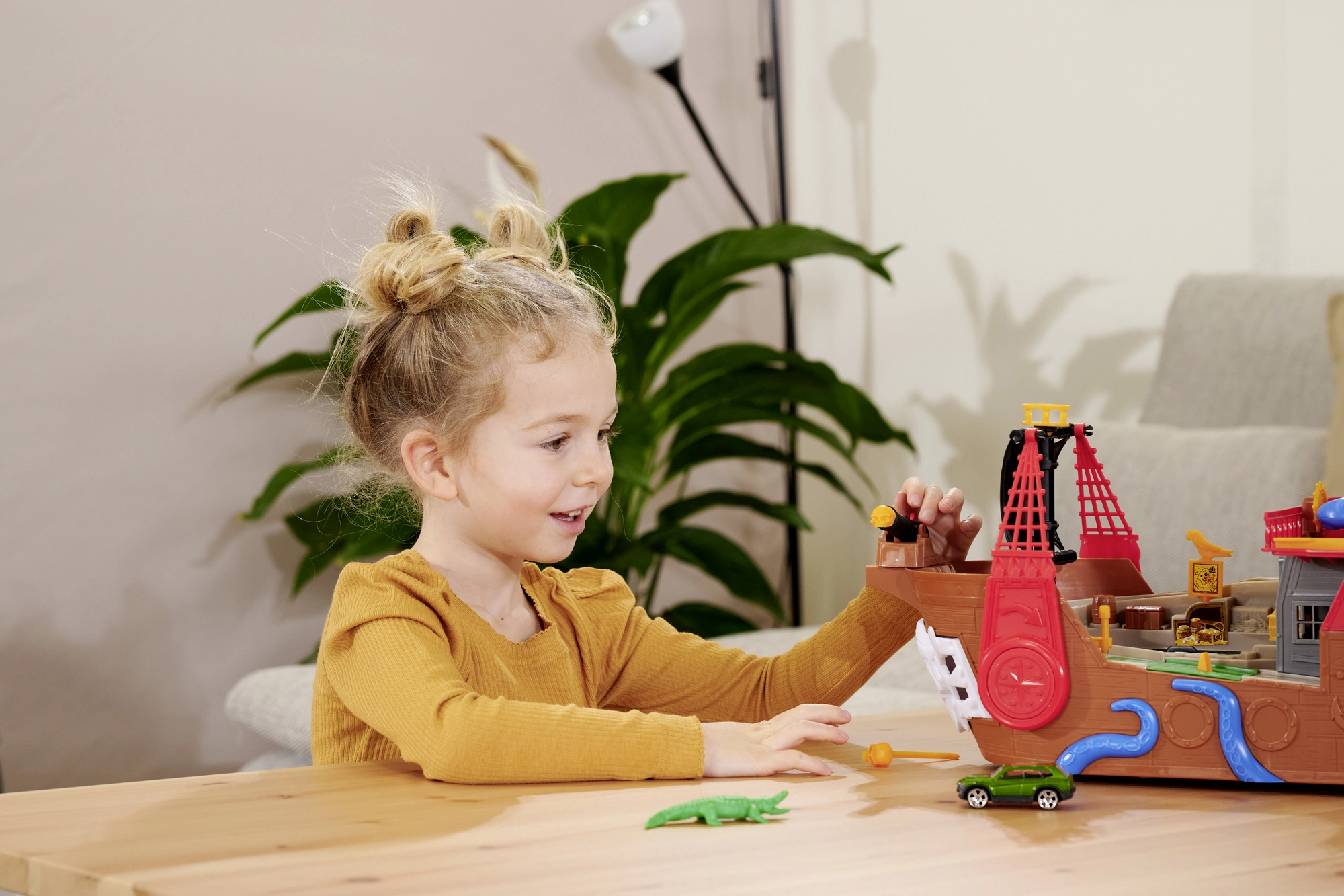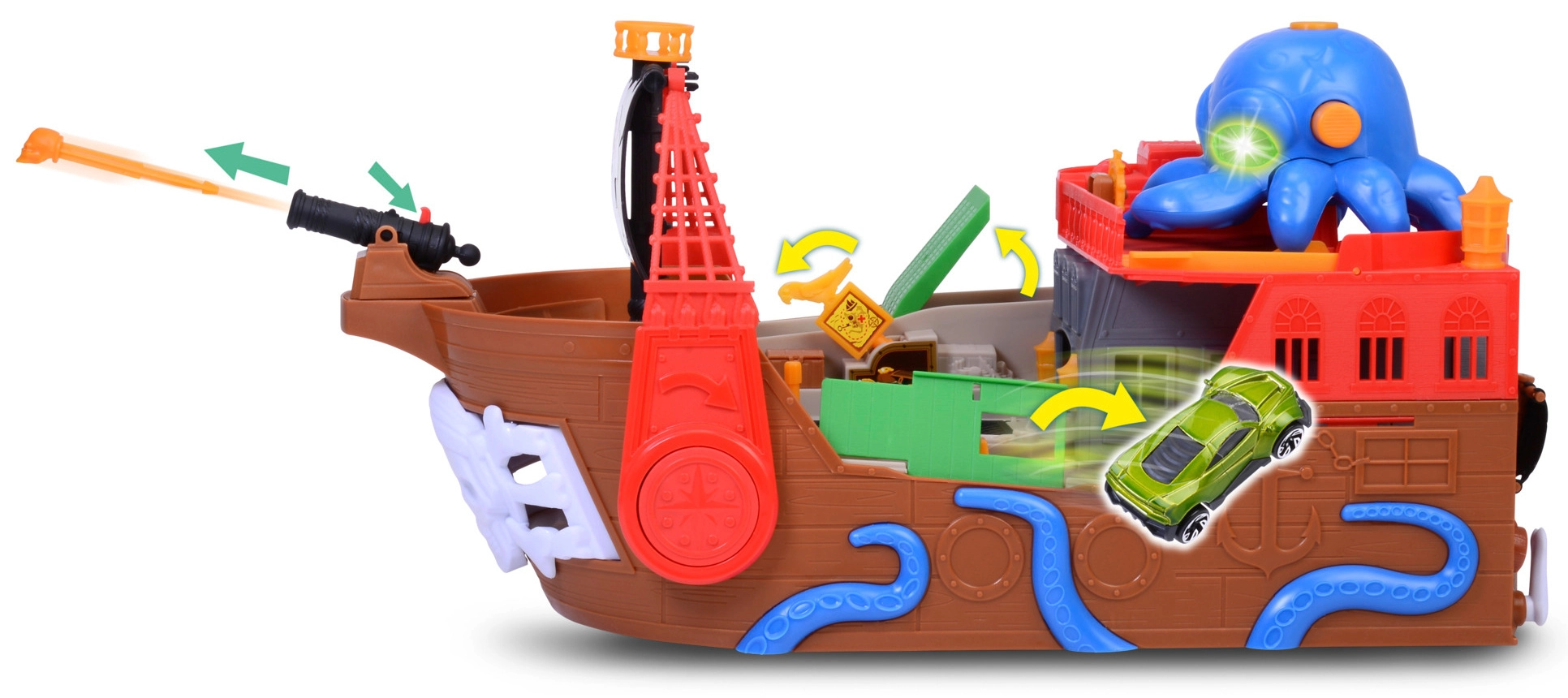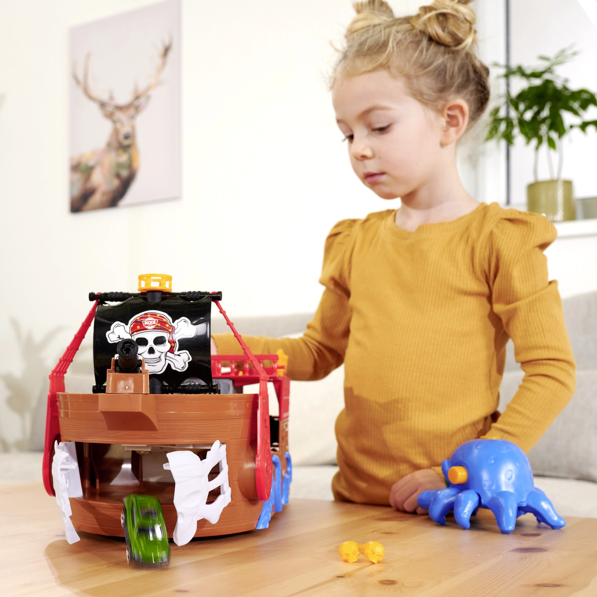 Questa nave pirata, curata nei dettagli, è un vero centro di divertimento. Sollevando il ponte si rivela la pista integrata per la macchinina in metallo, dove tramite leve e interruttori decidi se il veicolo volerà attraverso il portale a forma di teschio, finirà in prigione o verrà catapultato dalla zattera. Non mancano un cannone funzionante, un forziere del tesoro, barili, un coccodrillo e altri accessori che stimolano il gioco di fantasia.
