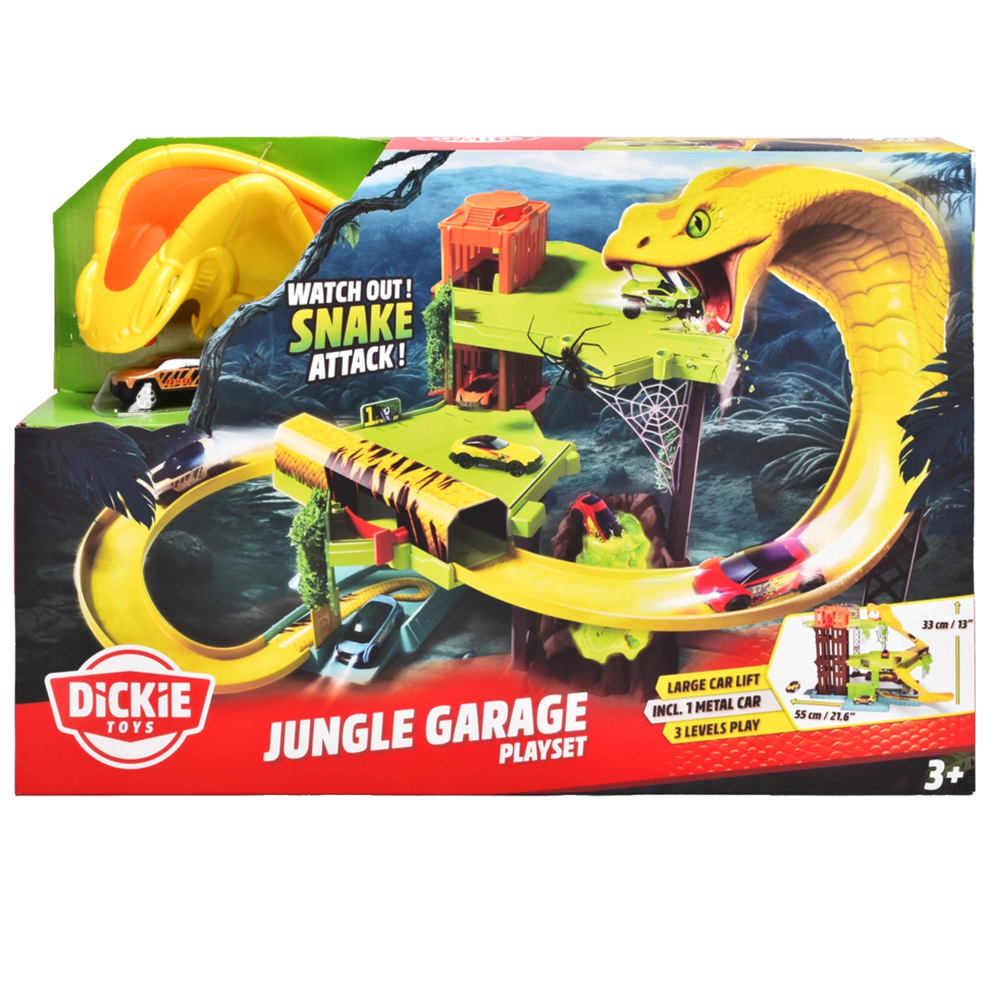 Lanciati in una corsa emozionante attraverso la giungla ed esplora tutti e tre i livelli della pista, dove ti attende un enorme serpente. La pista Dickie Toys è pensata per un gioco dinamico con discese e risalite fluide e, grazie al montacarichi mobile, sposti facilmente la macchinina tra i piani.