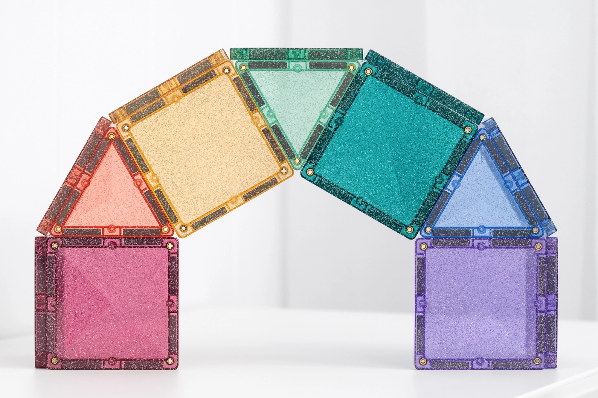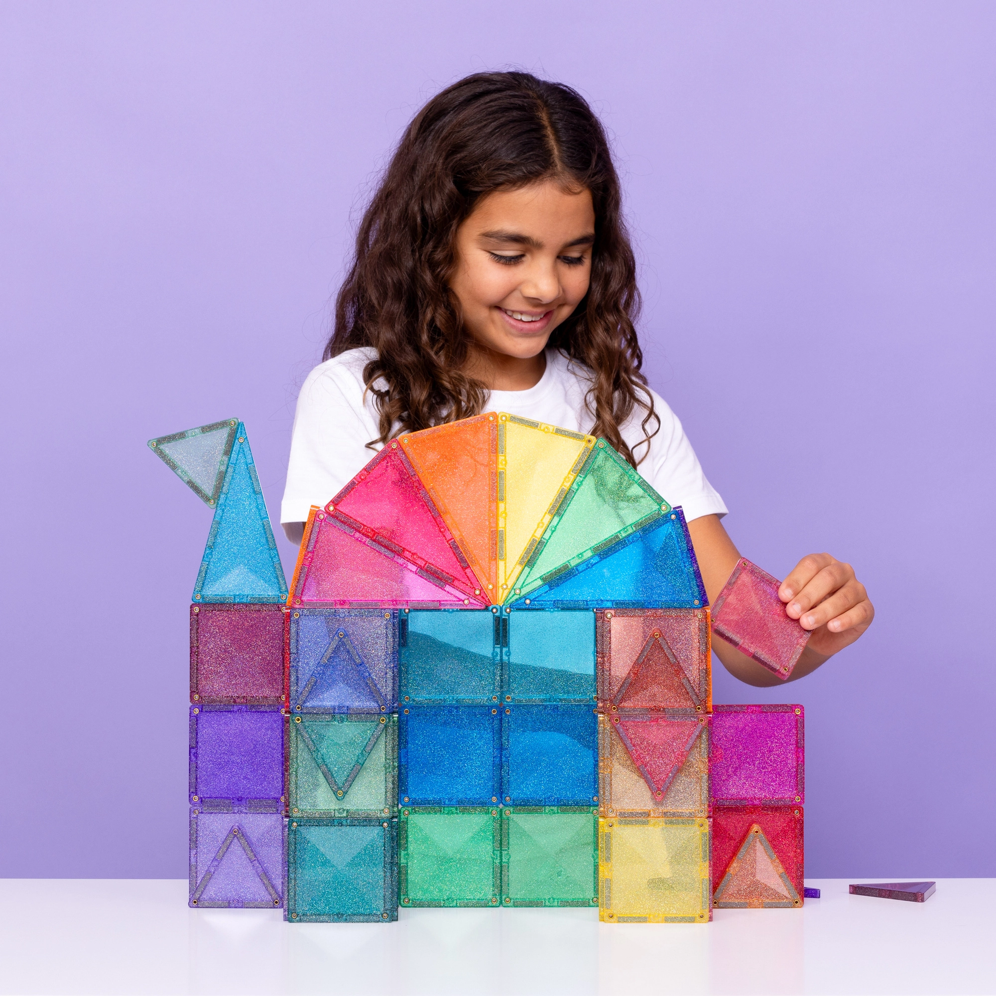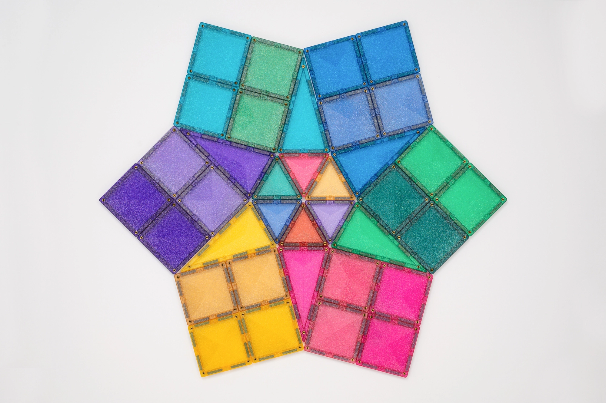 Il set include 48 pezzi magnetici di alta qualità con effetto glitter che, grazie ai magneti lungo il perimetro, si attraggono da tutti i lati garantendo strutture stabili. Le tessere colorate traslucide in resistente ABS privo di BPA e ftalati sono ideali per un gioco sicuro dai 3 anni e offrono una piacevole “click” sensation all’unione.