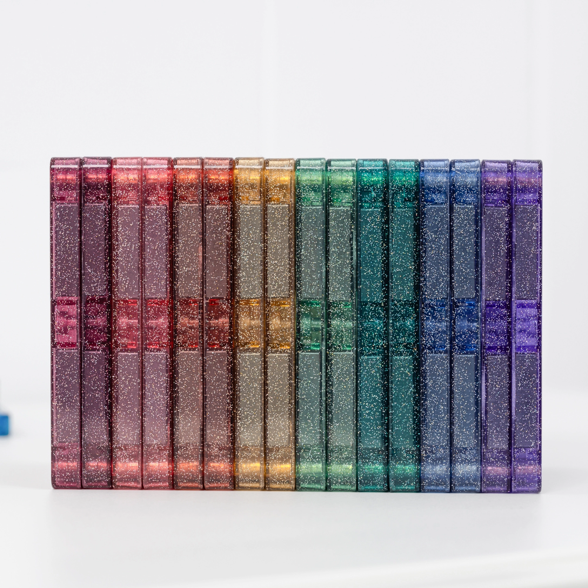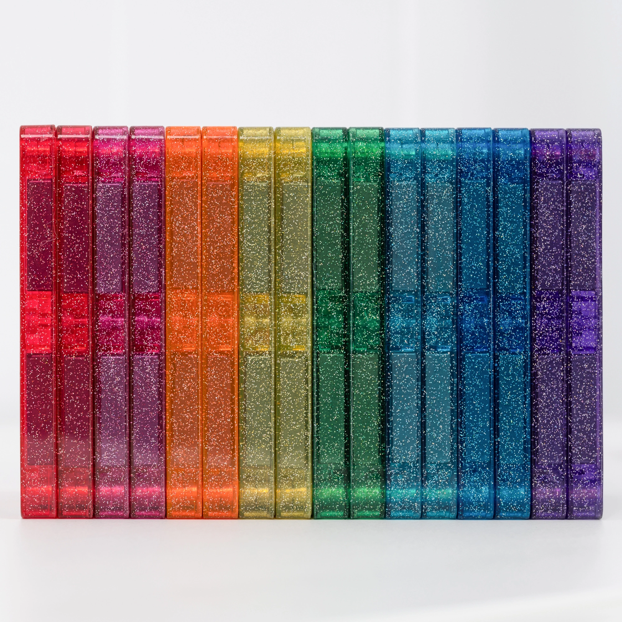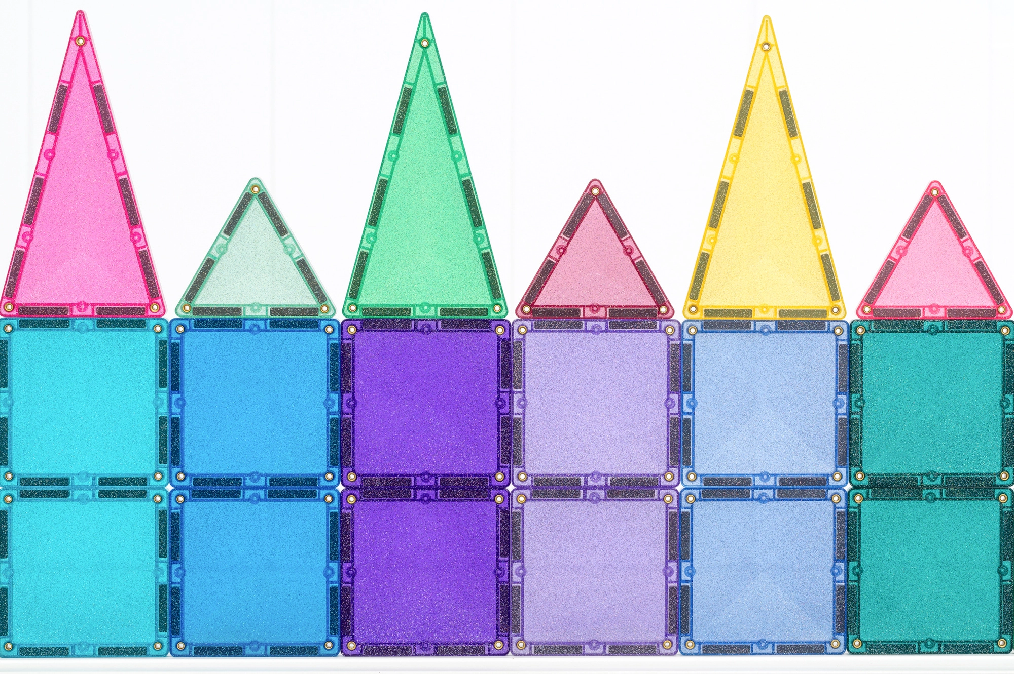 Il set include 48 pezzi magnetici di alta qualità con effetto glitter che, grazie ai magneti lungo il perimetro, si attraggono da tutti i lati garantendo strutture stabili. Le tessere colorate traslucide in resistente ABS privo di BPA e ftalati sono ideali per un gioco sicuro dai 3 anni e offrono una piacevole “click” sensation all’unione.
