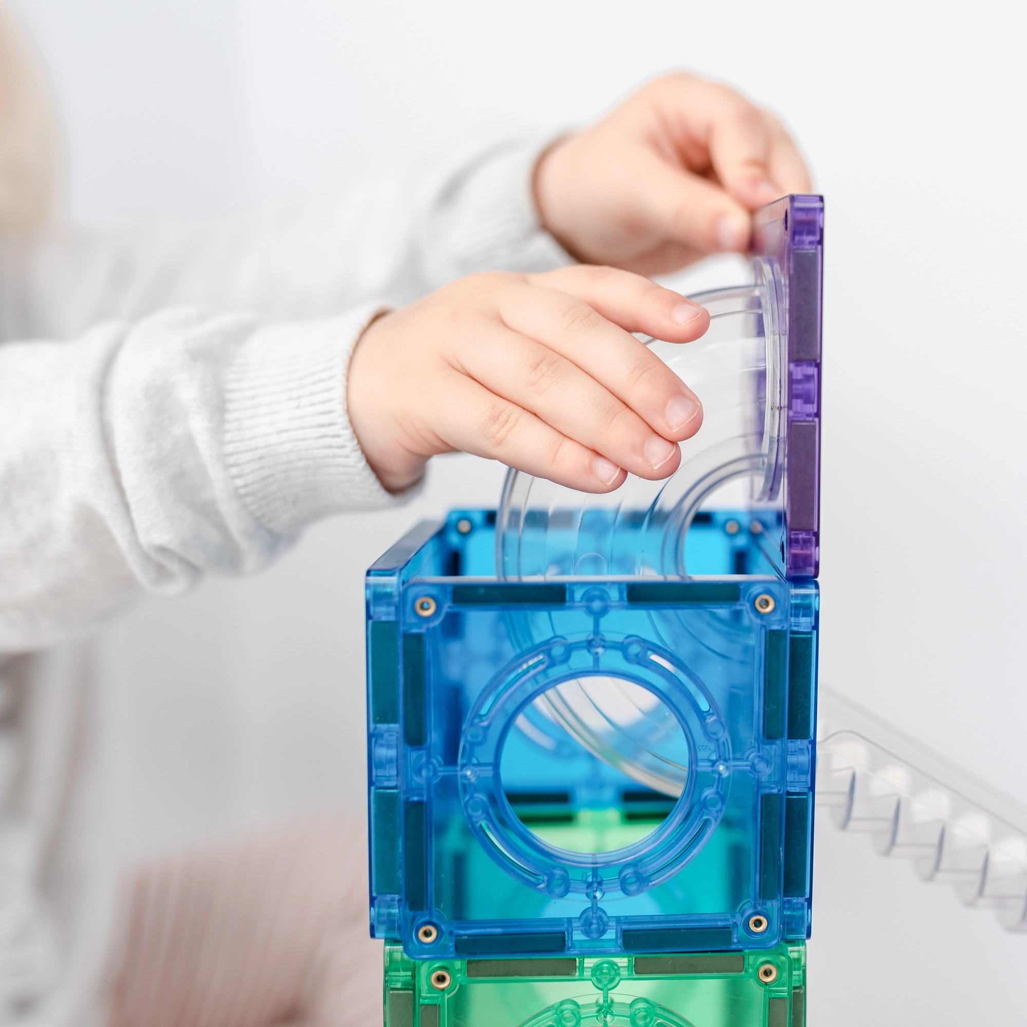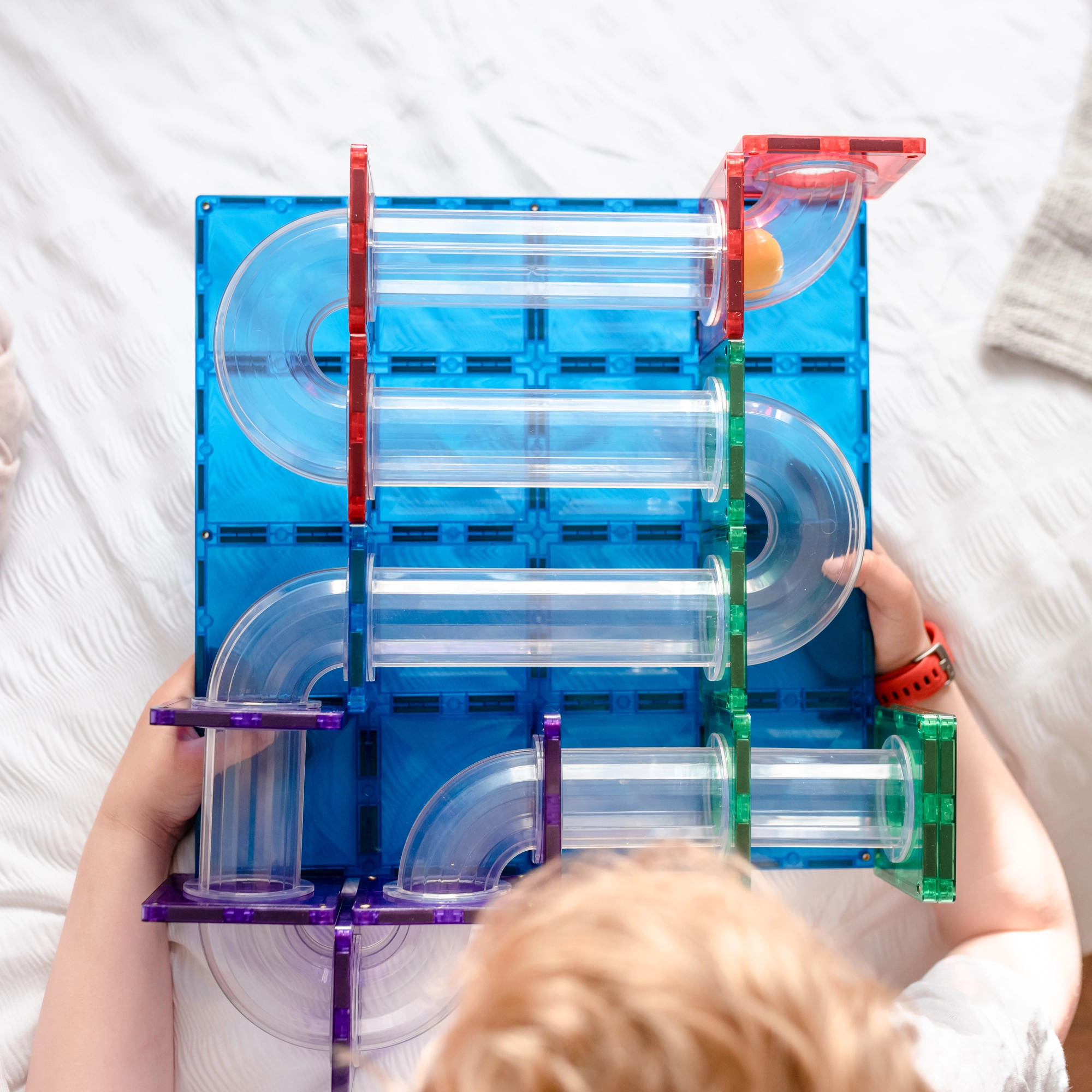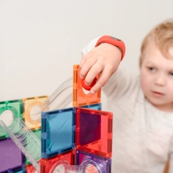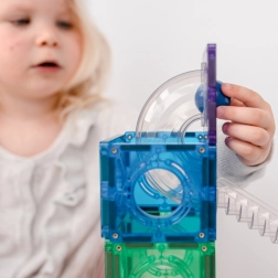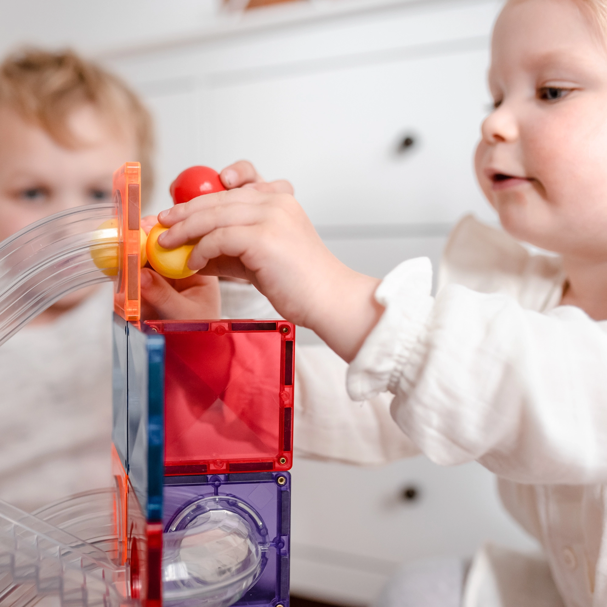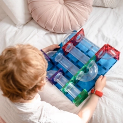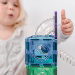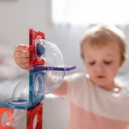 Costruisci torri colorate, ponti e piste per biglie ingegnose, osserva il percorso delle biglie attraverso i tunnel trasparenti e scopri i principi di gravità, velocità ed equilibrio. Le tessere Connetix nei colori dell’arcobaleno hanno magneti saldamente ribattuti che si attraggono da ogni lato, così le costruzioni restano stabili e lo “scatto” all’aggancio è estremamente soddisfacente.