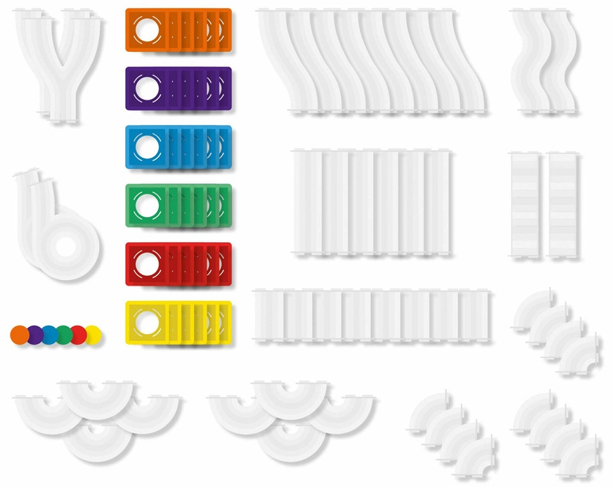 Tubi chiari, curve, esse e giunzioni a Y consentono di osservare il movimento delle biglie ed esplorare velocità, gravità e causa-effetto con configurazioni diverse.