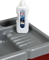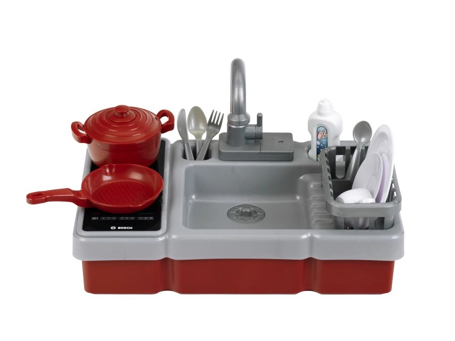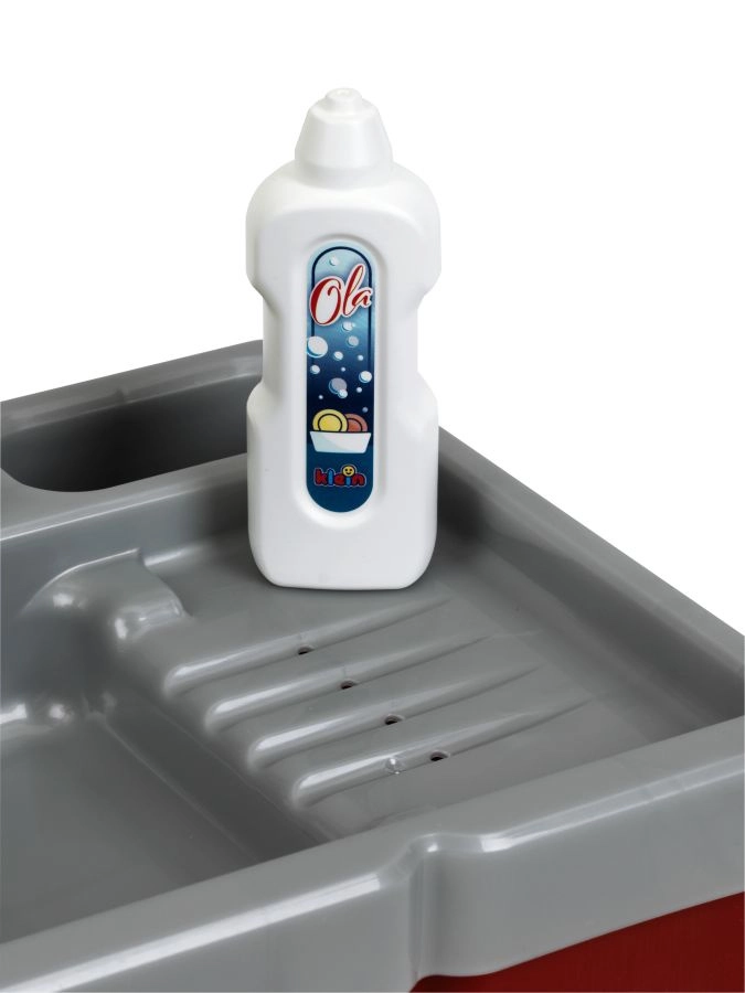 Basta riempire il serbatoio e ruotare la manopola: l’acqua scorre come in un vero lavello. I bambini possono provare in sicurezza a lavare piatti e posate.