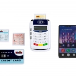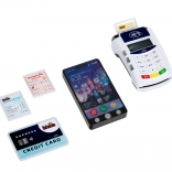 Nella confezione trovi una carta di pagamento, 3 scontrini e uno smartphone con schermo olografico che supporta il pagamento con “bip”. Il telefono ha 3 pulsanti funzionali con diversi suoni e una torcia. Il terminale è alimentato a batterie (non incluse), così il divertimento può durare per ore.