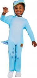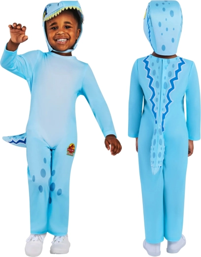Il cappuccio sagomato a testa di dinosauro, la stampa a macchie e la linea dorsale decorativa conferiscono al costume l’aspetto fedele del Velociraptor di JURASSIC WORLD.