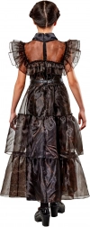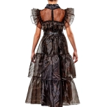 Abito nero lungo a strati con colletto alto e maniche a balza che richiama fedelmente l’iconica scena Rave'n Dance della serie WEDNESDAY.