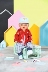Outfit alla moda per bambole BABY born di 36 cm con un tocco da motociclista: giacca rossa effetto pelle con stampa dell'orsetto, pantaloni grigio-blu, sneakers blu e cappellino con visiera con l'anatrina Berta. Taglio easy fit per un cambio facile, incluso l'appendiabiti.