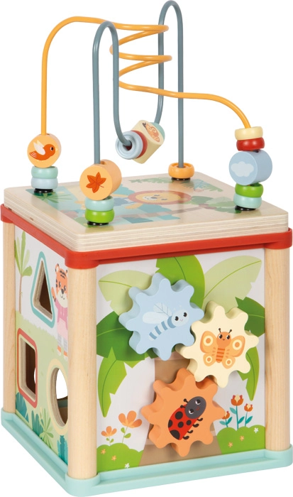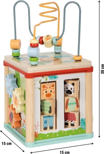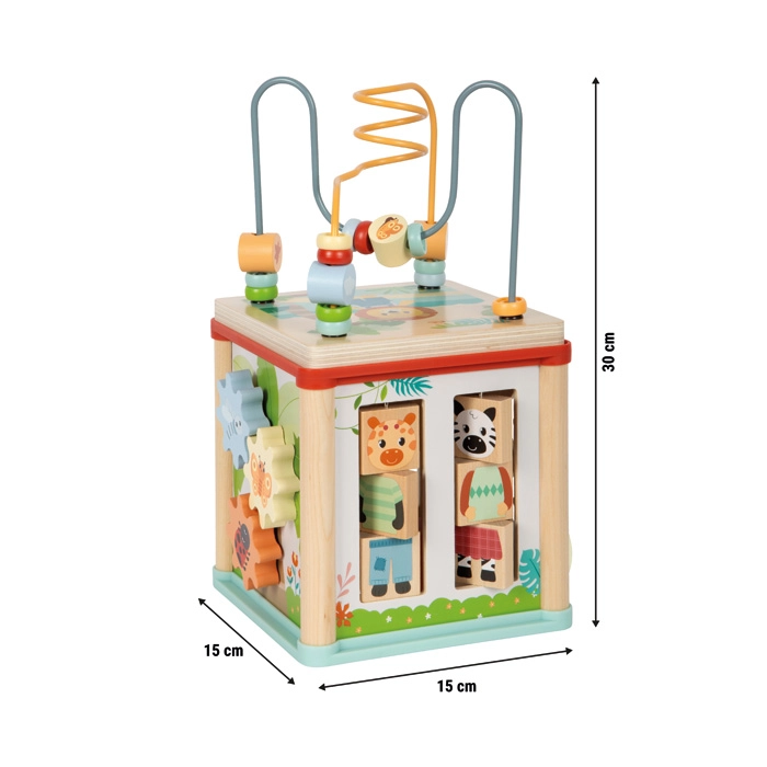 Il cubo motorico multifunzionale in legno certificato FSC offre ai bambini dai 12 mesi ricche opportunità di gioco e apprendimento. Include un labirinto di perline, inserimento di forme, ingranaggi, piste scorrevoli e blocchetti girevoli con animaletti. Il design compatto con coperchio rimovibile riponibile all’interno fa risparmiare spazio, sviluppa la motricità fine, la coordinazione mano-occhio, la percezione di forme e colori e stimola la creatività dei bambini.