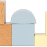 Il set include cubi, cilindri, archi e pezzi stampati in colori naturali e pastello, che stimolano la fantasia e il pensiero spaziale.