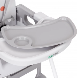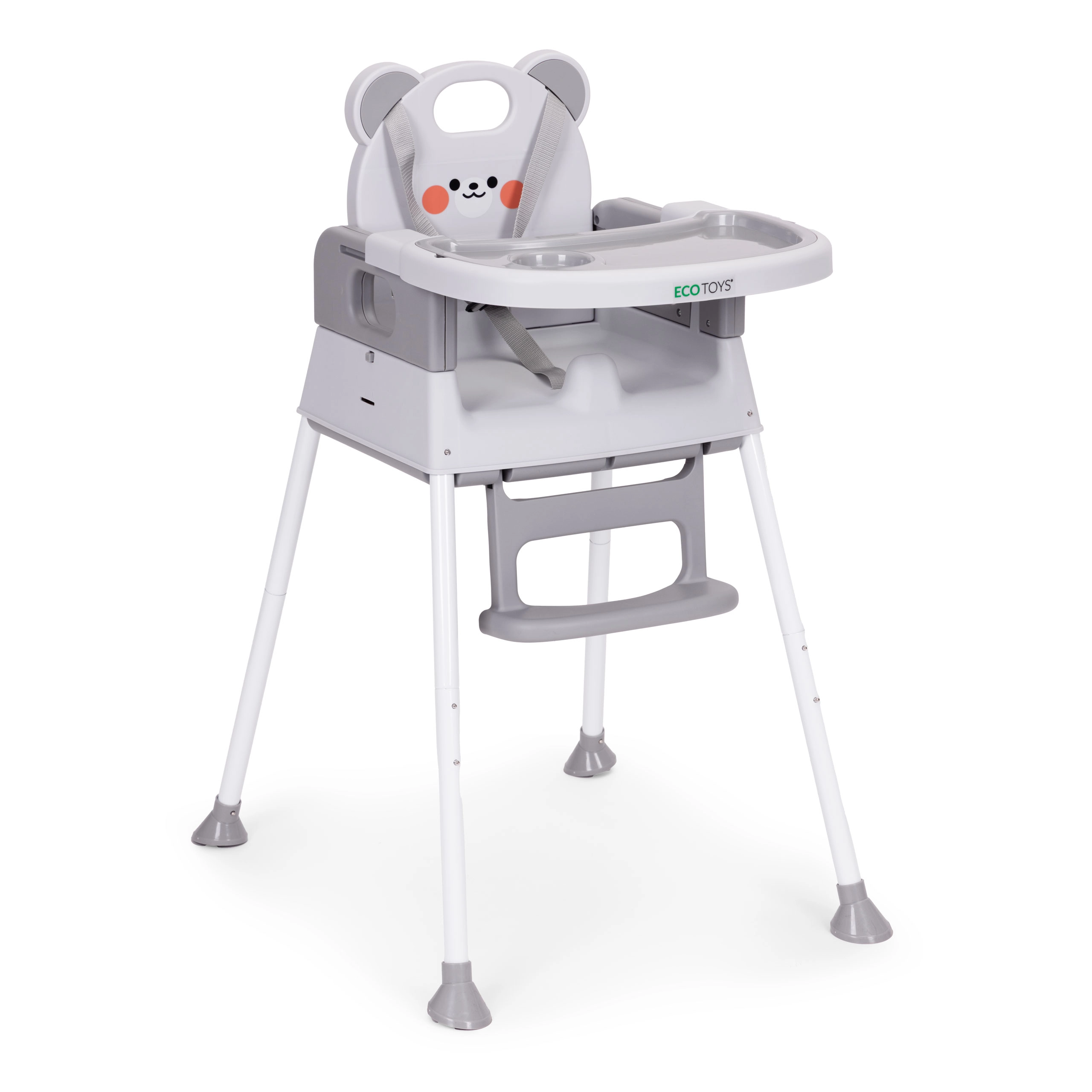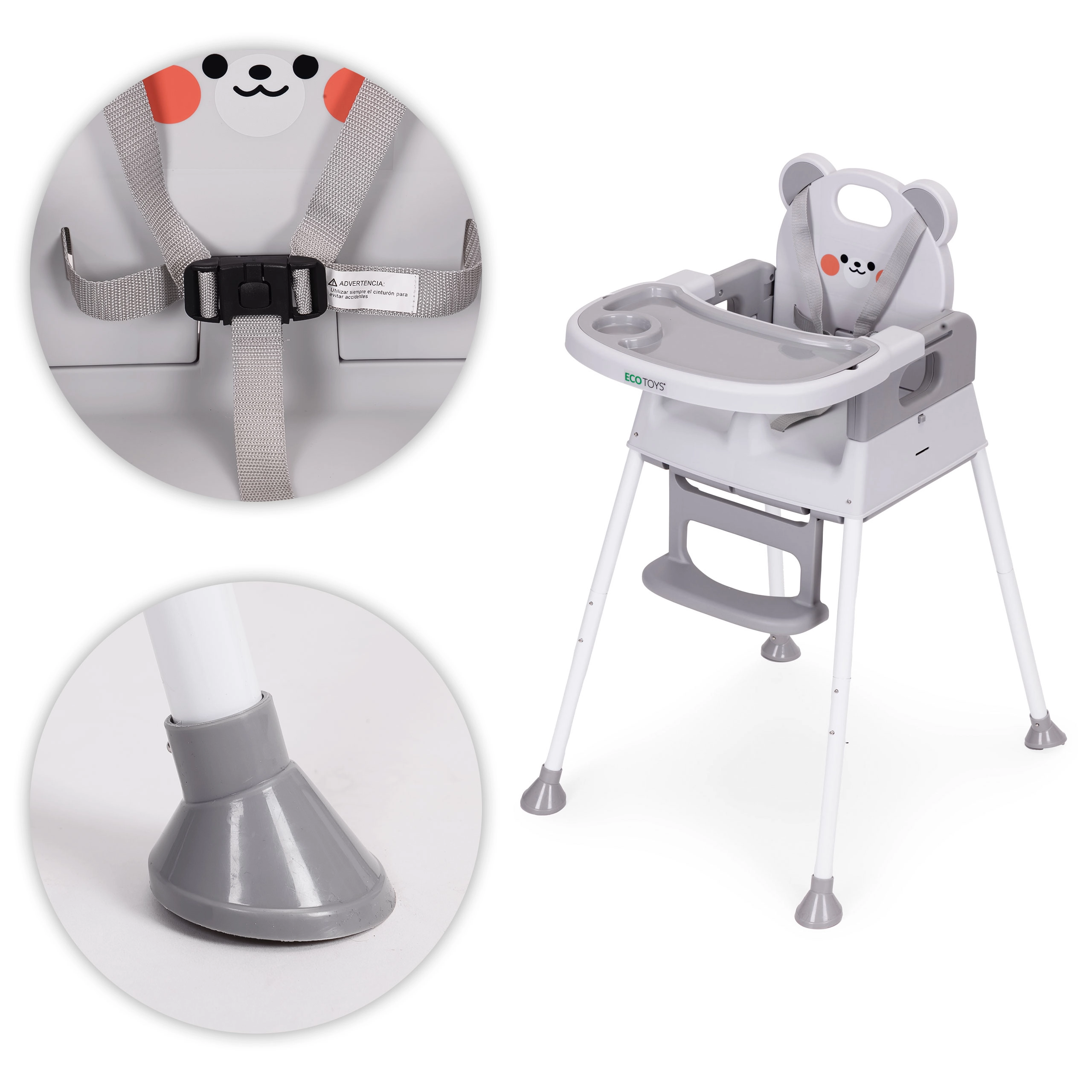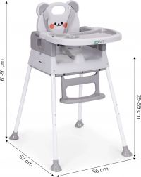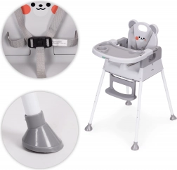 La sicurezza è assicurata da una cintura a 5 punti, dallo spartigambe di sicurezza anti-scivolamento e dai piedini antiscivolo. L’ampio doppio vassoio con bordi rialzati e portabicchiere è regolabile; lo strato superiore si rimuove facilmente e si lava in lavastoviglie. Poggiapiedi e seduta ergonomica garantiscono postura corretta e comfort durante i pasti e il gioco.