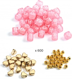 Elegante kit creativo con perline a lettere per realizzare braccialetti e collane personalizzati. I bambini possono comporre facilmente nomi o messaggi e creare gioielli originali nella variante dorata. Un'ottima scelta per motricità fine, creatività e come regalo per piccoli creatori.