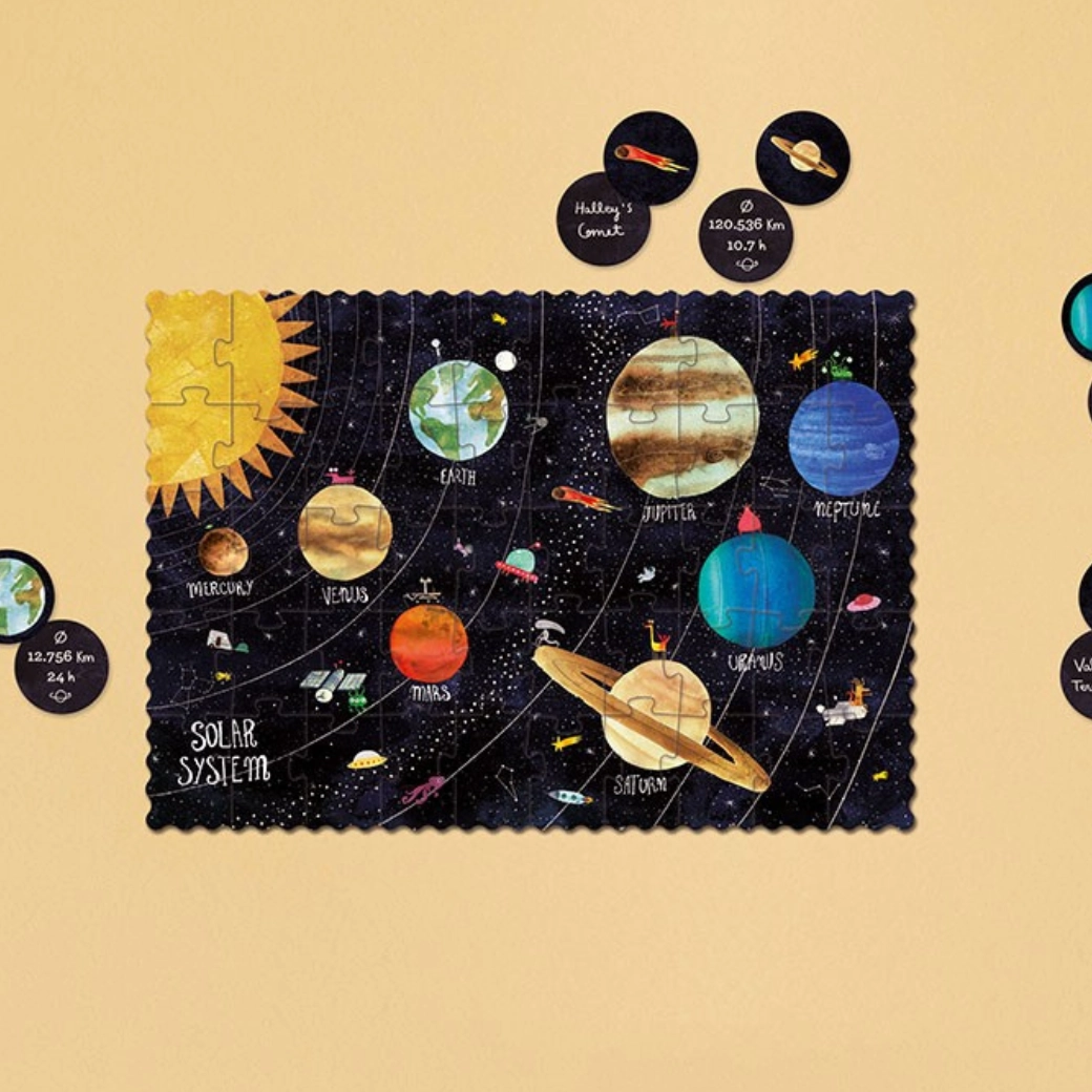 Esplora il sistema solare con il puzzle tascabile LONDJI! Un puzzle compatto con 50 pezzi che sviluppa motricità fine, pazienza e curiosità dei bambini. Ideale per i viaggi, da mettere nello zaino e come regalo creativo per piccoli esploratori dello spazio.
