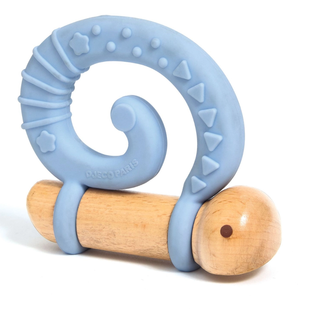 Il silicone morbido con diverse texture massaggia le gengive e allevia il fastidio della dentizione. La struttura leggera e la maniglia in legno facilitano la presa delle piccole manine.