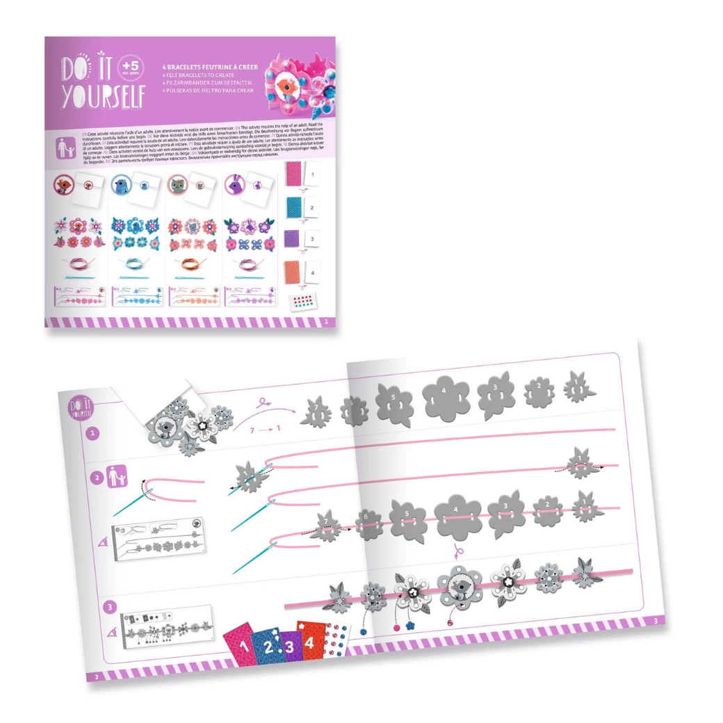 Il set include fiori, foglie e graziosi motivi in feltro vellutato dai colori intensi. I pezzi possono essere sovrapposti e combinati per un aspetto unico di ogni braccialetto.