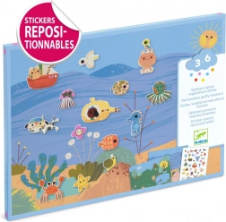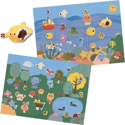 Questo set creativo offre due sfondi illustrati, il mondo sottomarino e la foresta con stagno, e un foglio di adorabili adesivi con pesciolini, un granchio, un sottomarino, una barchetta, animaletti del bosco e altri motivi. I bambini possono spostare liberamente gli adesivi e inventare sempre nuove storie.