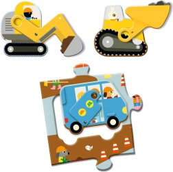 Il puzzle interattivo Cantiere di Djeco unisce costruzione e gioco in uno. Dopo aver completato l'immagine, i bambini possono “dare vita” alla scena del cantiere grazie ai componenti mobili su alcuni pezzi: l'escavatore carica la terra, il camion la trasporta e il lavoro può iniziare. I pezzi grandi e robusti sono facili da afferrare e adatti alle mani dei più piccoli.