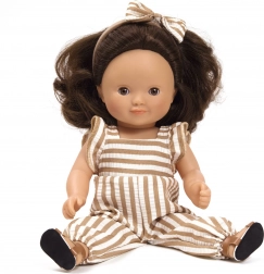 L’outfit a righe, il cerchietto coordinato e i comodi sandaletti donano alla bambola uno stile personale. I tratti realistici e i capelli castani incoraggiano un gioco empatico e di cura, che sviluppa le competenze sociali.
