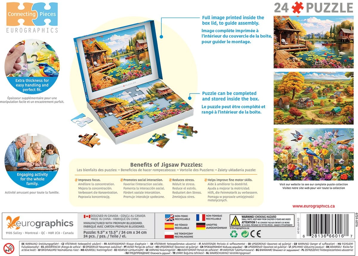 Goditi il tranquillo soggetto di una baita sul lago con un puzzle adatto a tutte le età. La serie Connecting Pieces di EUROGRAPHICS supporta abilità cognitive, motricità fine e interazione sociale. Grazie ai pezzi grandi è ideale per anziani e persone con mobilità ridotta. La pratica scatola con coperchio funge anche da cornice per l’assemblaggio, e all’interno del coperchio c’è un anteprima del soggetto per un orientamento più semplice. Realizzato in modo ecologico con cartone riciclato e stampato con inchiostri a base vegetale.
