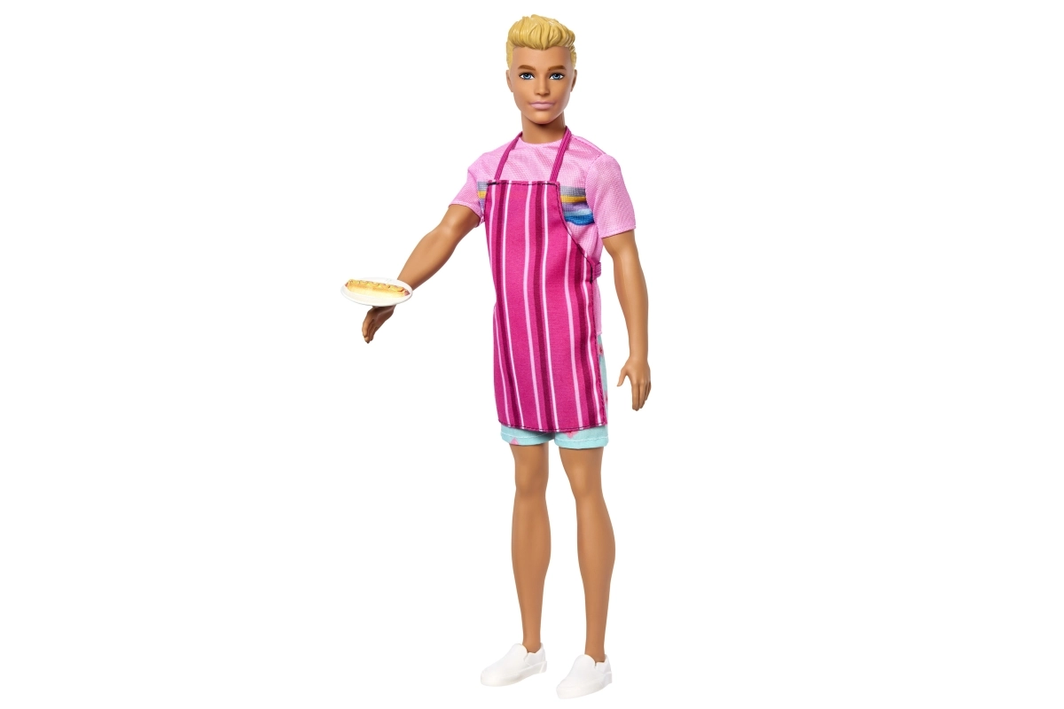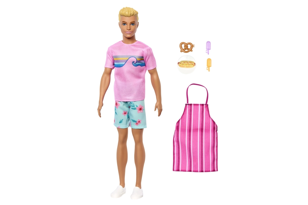 - Bambola Ken, maglietta rosa, pantaloncini floreali, scarpe bianche, grembiule a righe, pretzel, hot dog, 2× ghiacciolo
