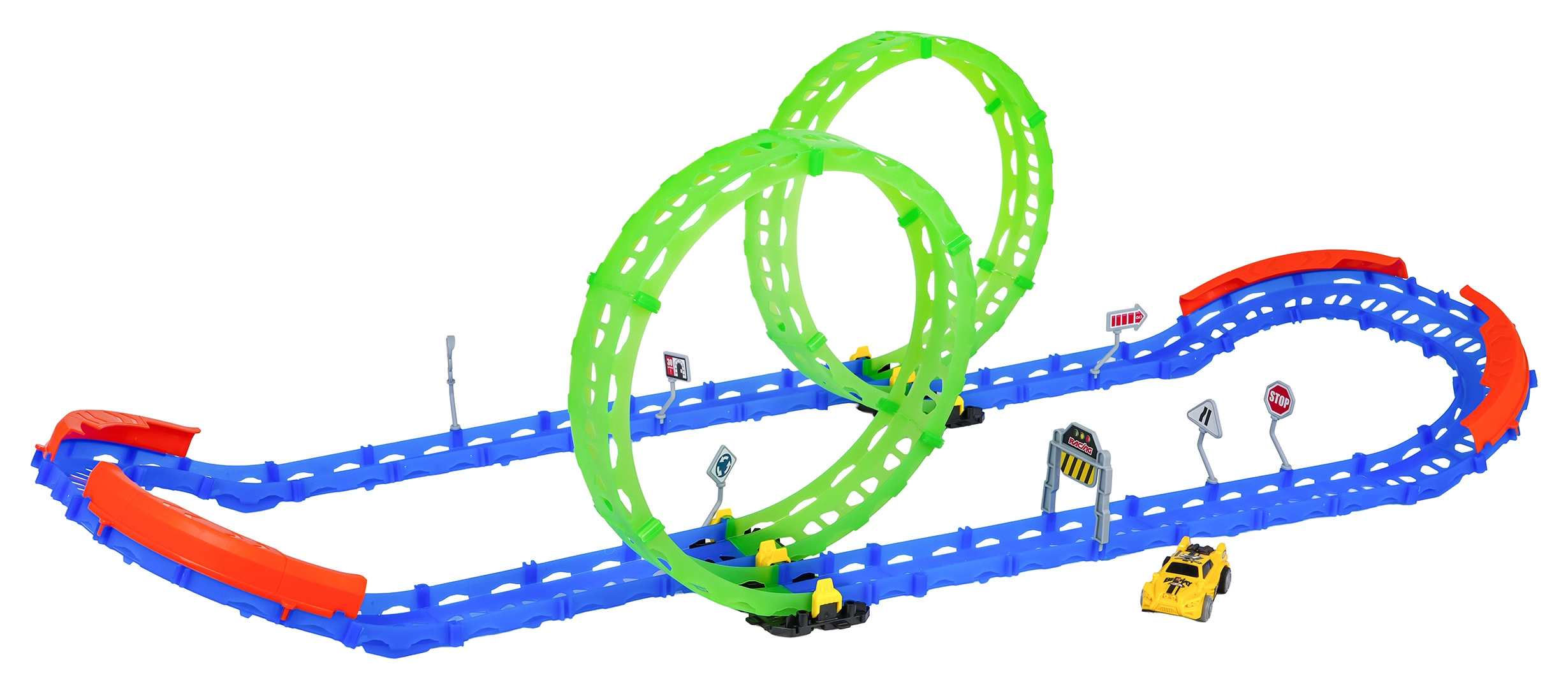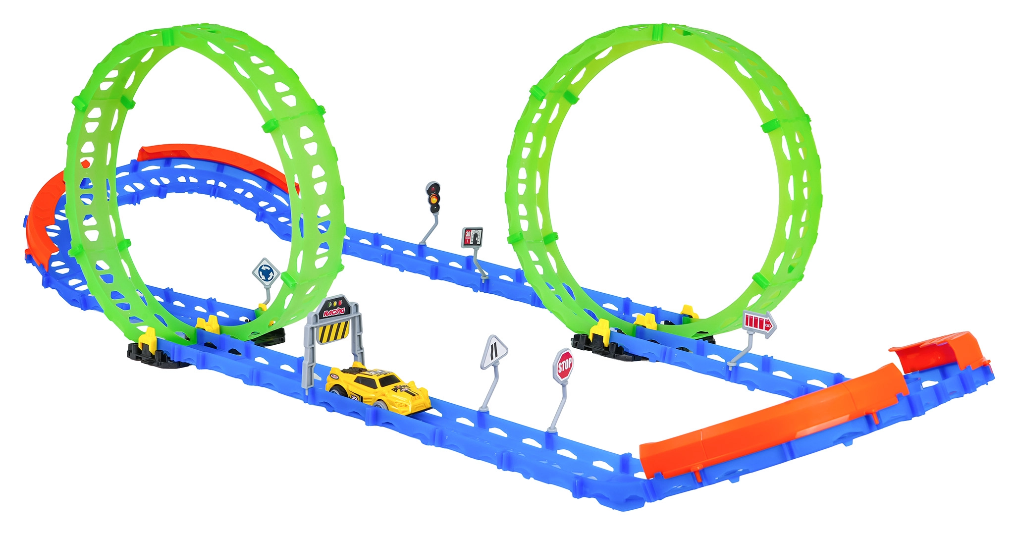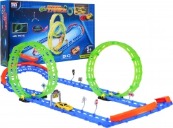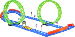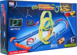 Questa pista da corsa fluorescente è ideale per bambini dai 3 anni in su. Grazie a due grandi loop e alle robuste barriere laterali, l'auto percorre in sicurezza anche curve strette. Gli elementi fotoluminescenti illuminano la corsa nella penombra e trasformano la stanza in un piccolo circuito.