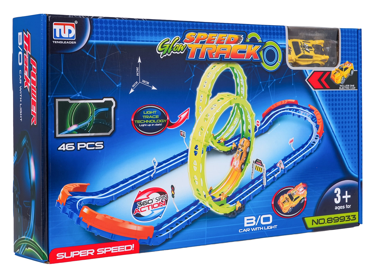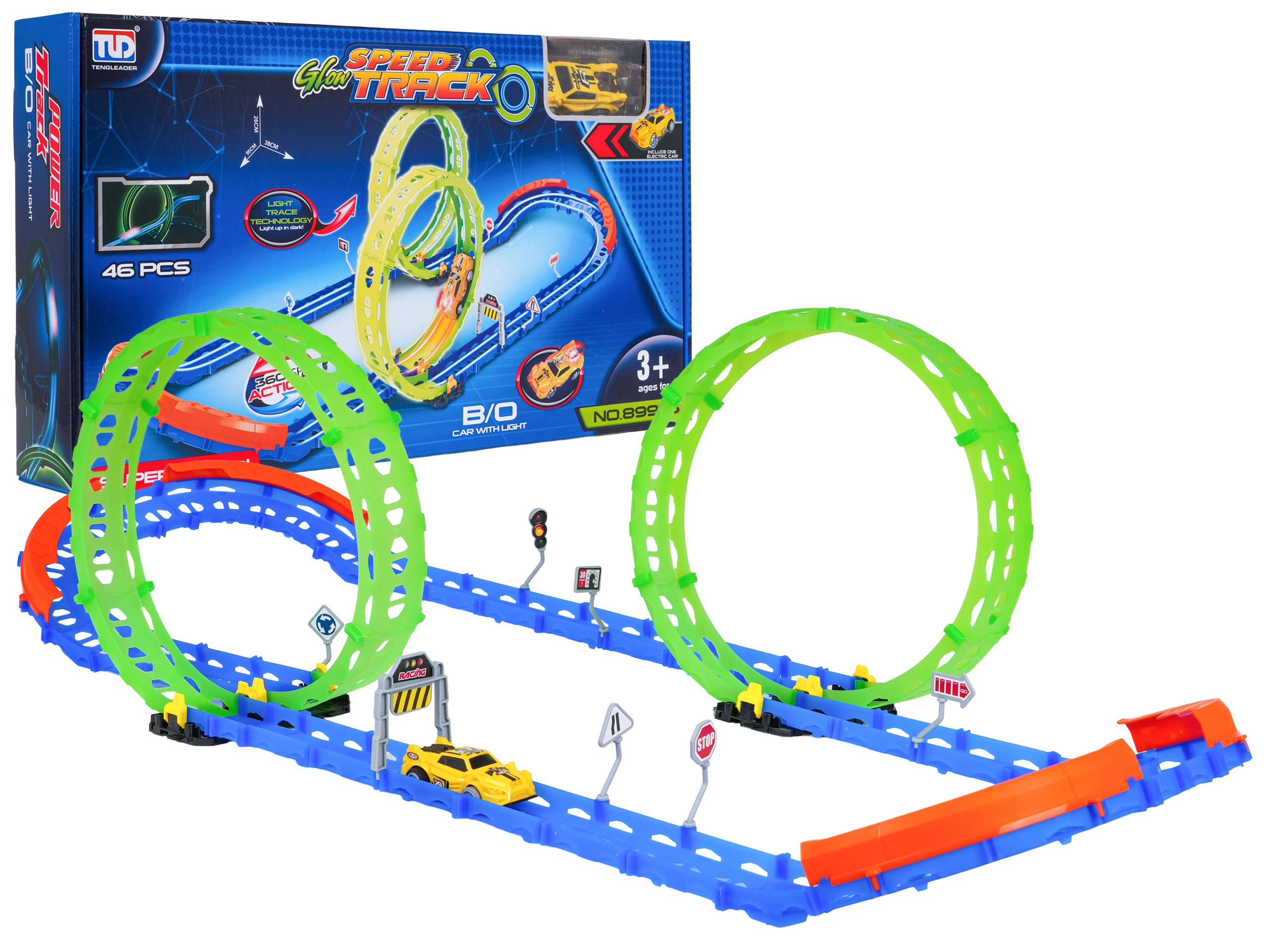 Goditi un divertimento senza fine con la pista da corsa che si illumina al buio! Questo set da 46 pezzi offre due loop a 360°, curve strette con barriere di sicurezza e un'auto veloce con luci. Montaggio semplice e struttura modulare giocosa garantiscono tante acrobazie e fantasia.