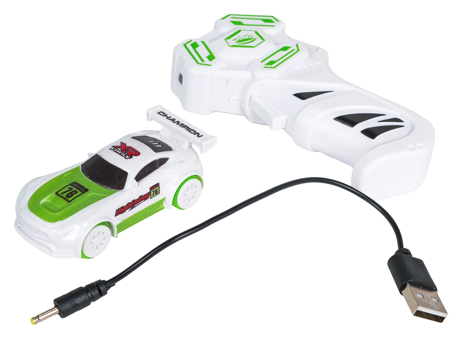 Il controller a pistola assicura un controllo comodo; la macchinina si ricarica via USB. Controller: 2× AAA (non incluse). Macchinina: batteria ricaricabile 3,7 V.