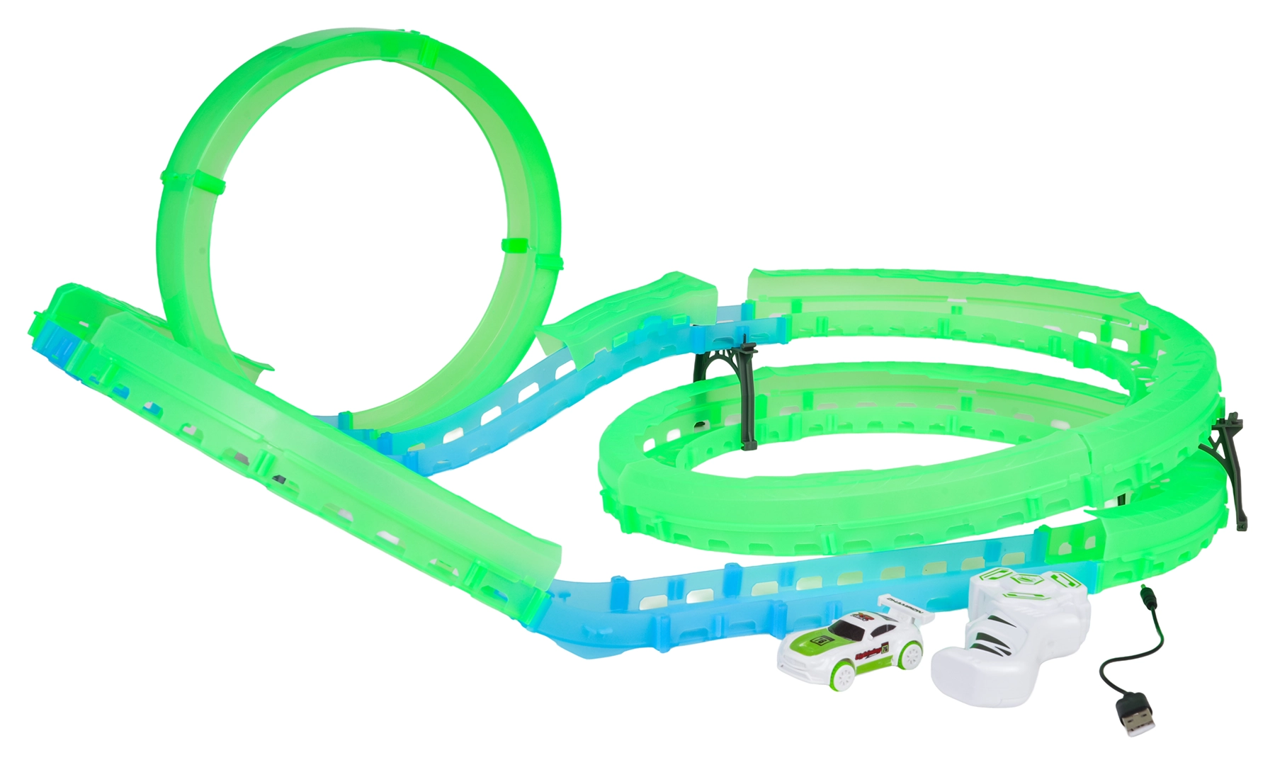 - Pista e elementi costruttivi, macchinina RC, telecomando, cavo USB, istruzioni di montaggio