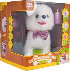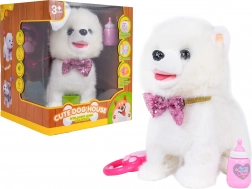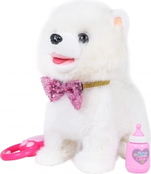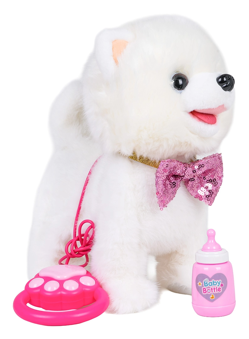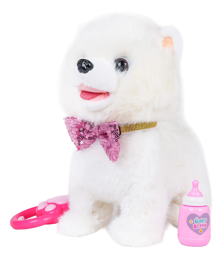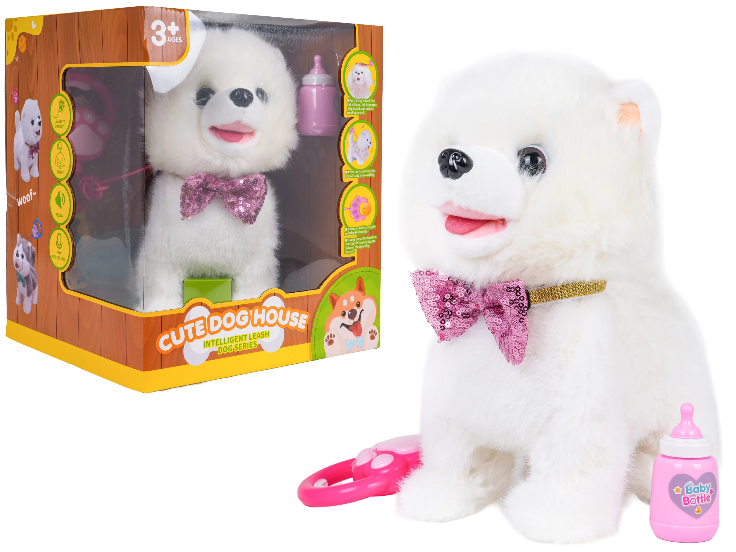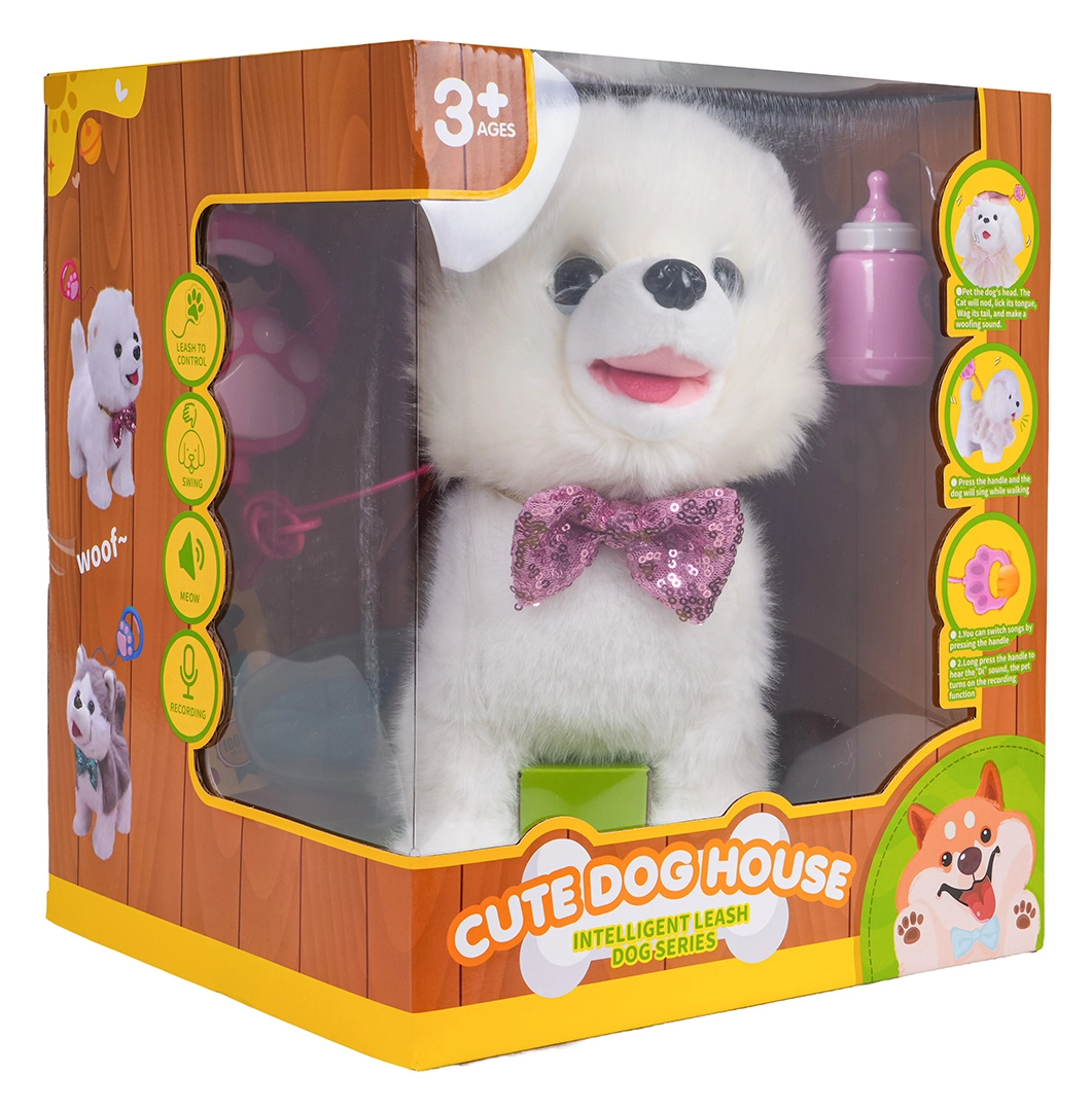 Cagnolino interattivo di peluche bianco con guinzaglio e biberon