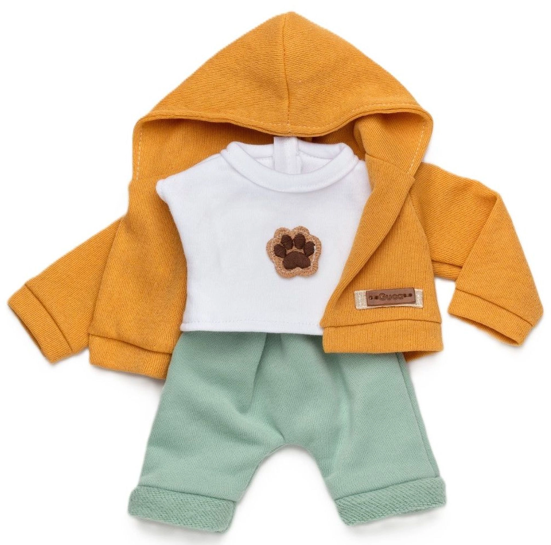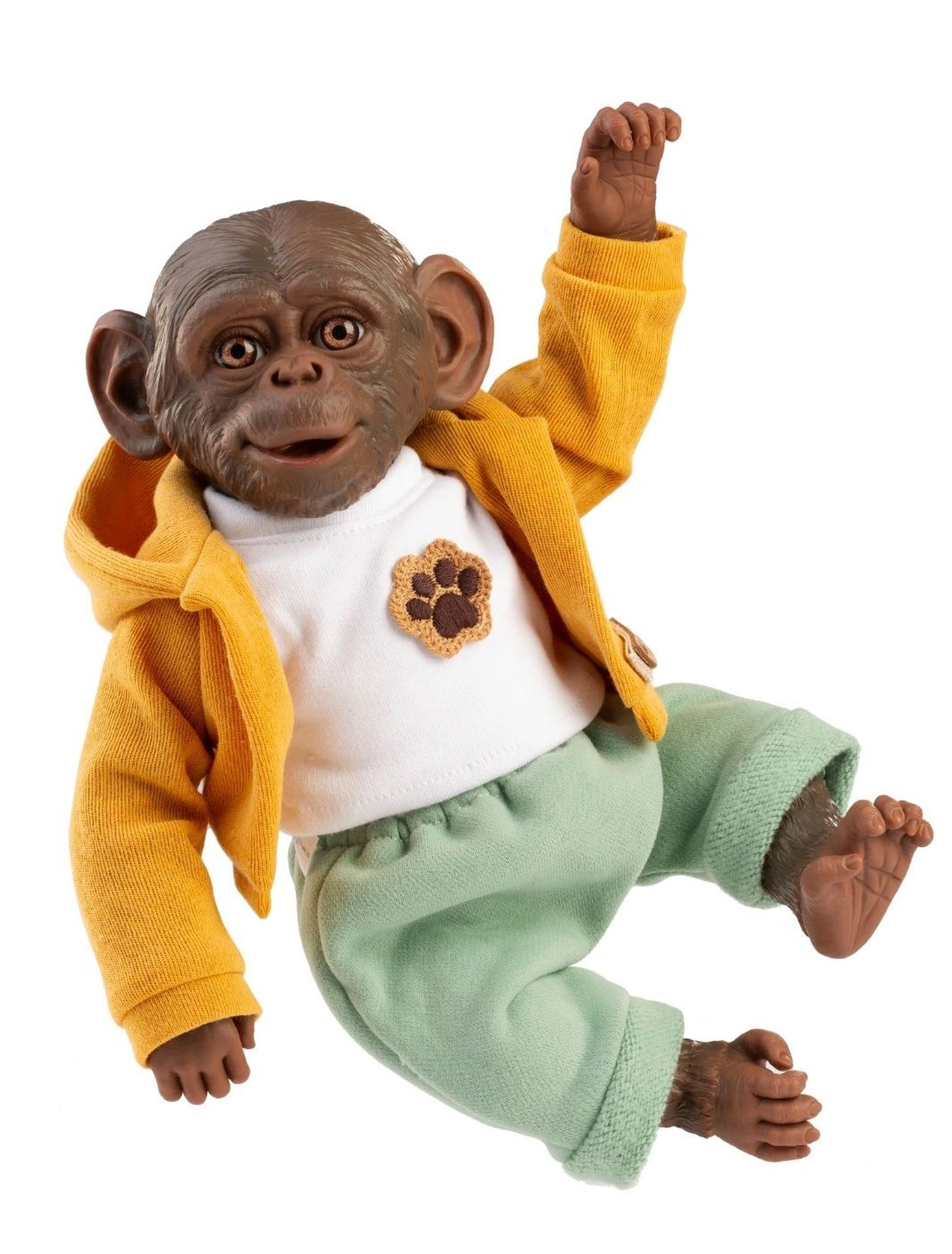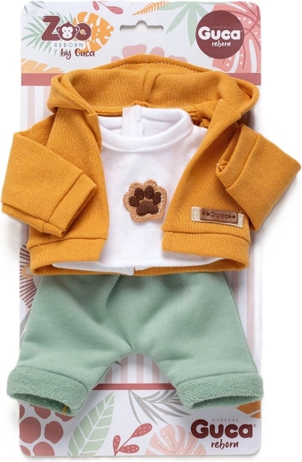 Dona alla tua scimmietta Reborn da 32 cm uno stile unico. Questo set da 3 pezzi unisce comfort e un design adorabile: felpa con cappuccio color senape per calore e stile, maglietta bianca con applicazione a zampa e pantaloni color menta con polsini morbidi per una vestibilità perfetta. I capi sono pensati per cambi frequenti e facile manutenzione.