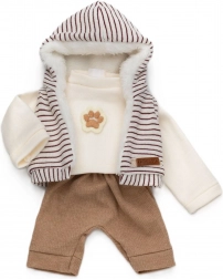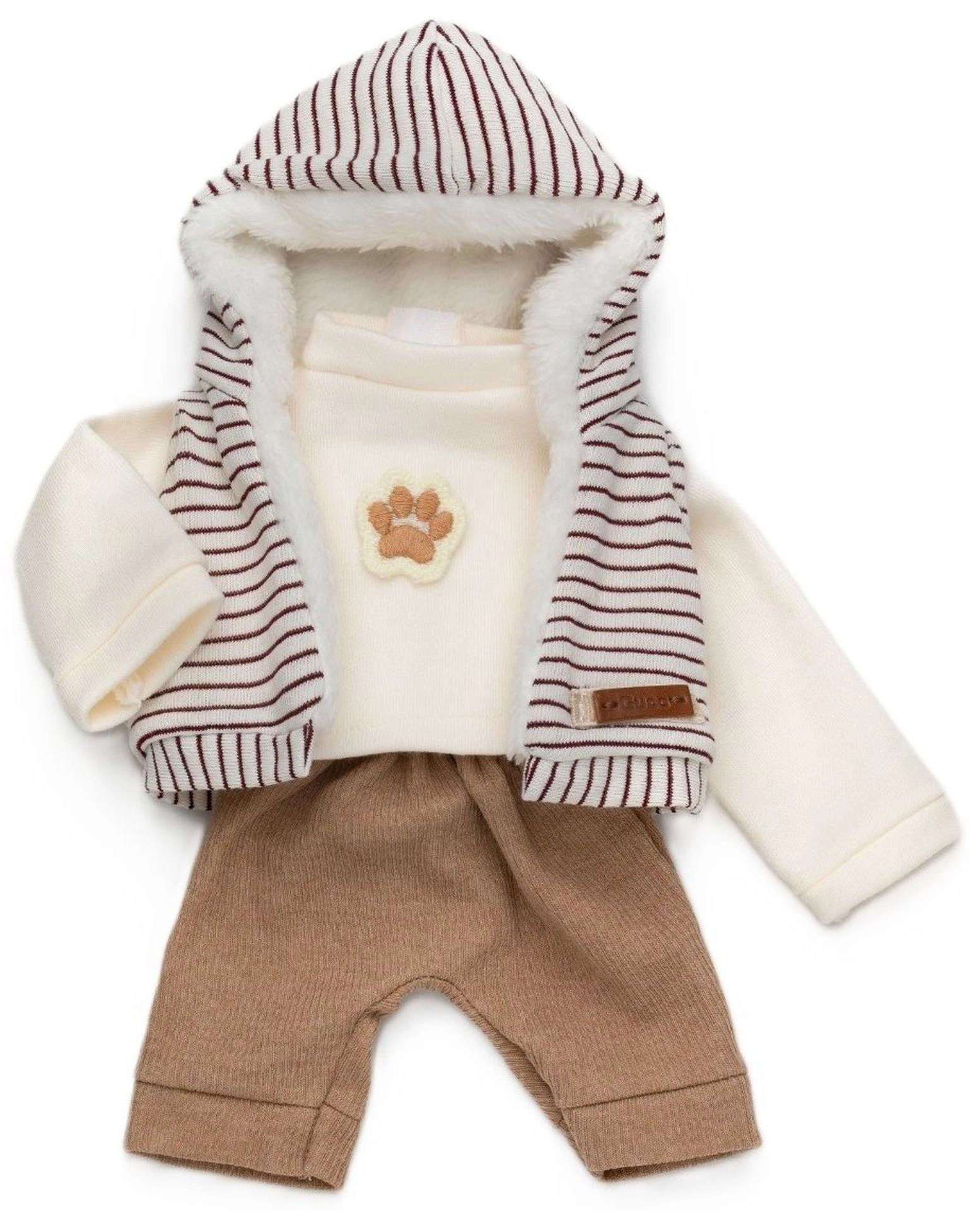 Maglietta color crema, gilet a righe con cappuccio e fodera calda e pantaloni confortevoli compongono un outfit coordinato facile da abbinare per i bambini.