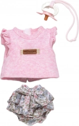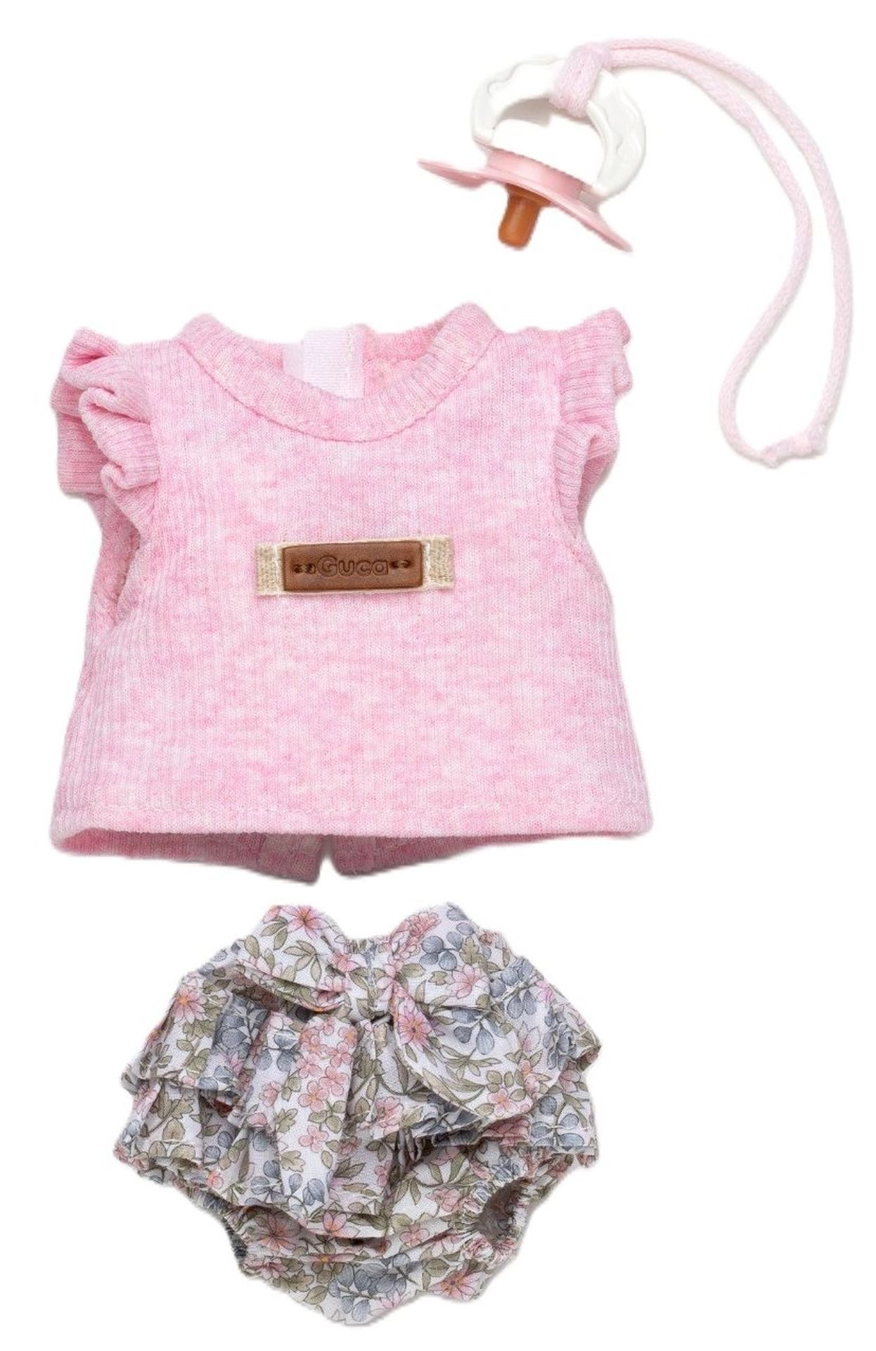 Il top rosa con volant, i bloomers floreali e il ciuccio creano un set perfettamente coordinato per il gioco e i cambi d’abito di ogni giorno.