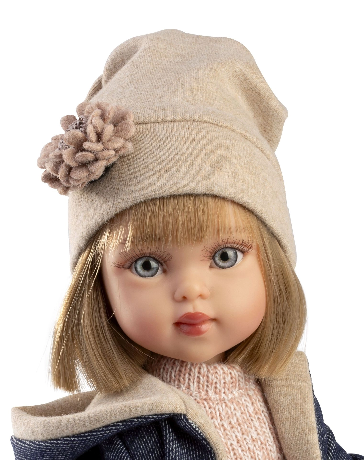 Elegante set di vestitini 5 pezzi per la bambola PENELOPE 34 cm che include abito, cappellino, cappottino, accessori e scarpine stringate in pelle. Fatto a mano in Spagna con materiali di qualità, ideale per cambi creativi e per stimolare la fantasia dei bambini dai 3 anni.