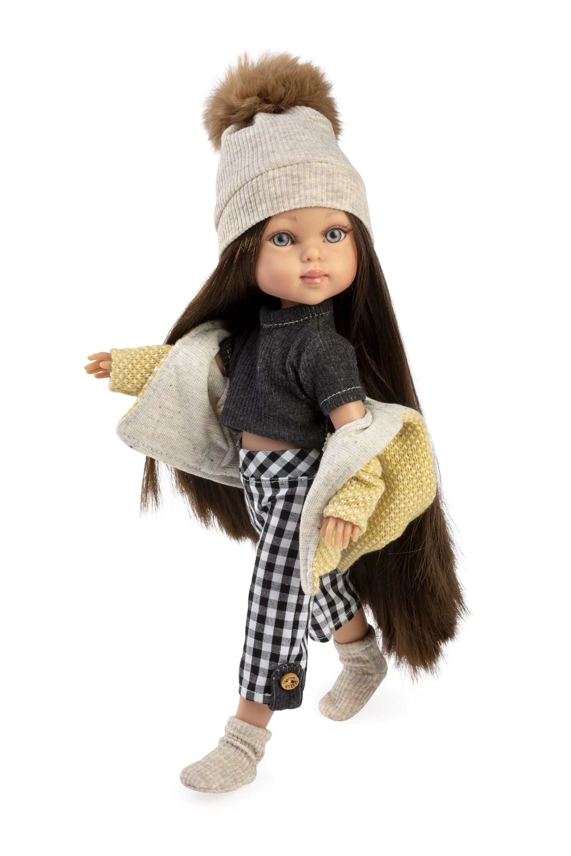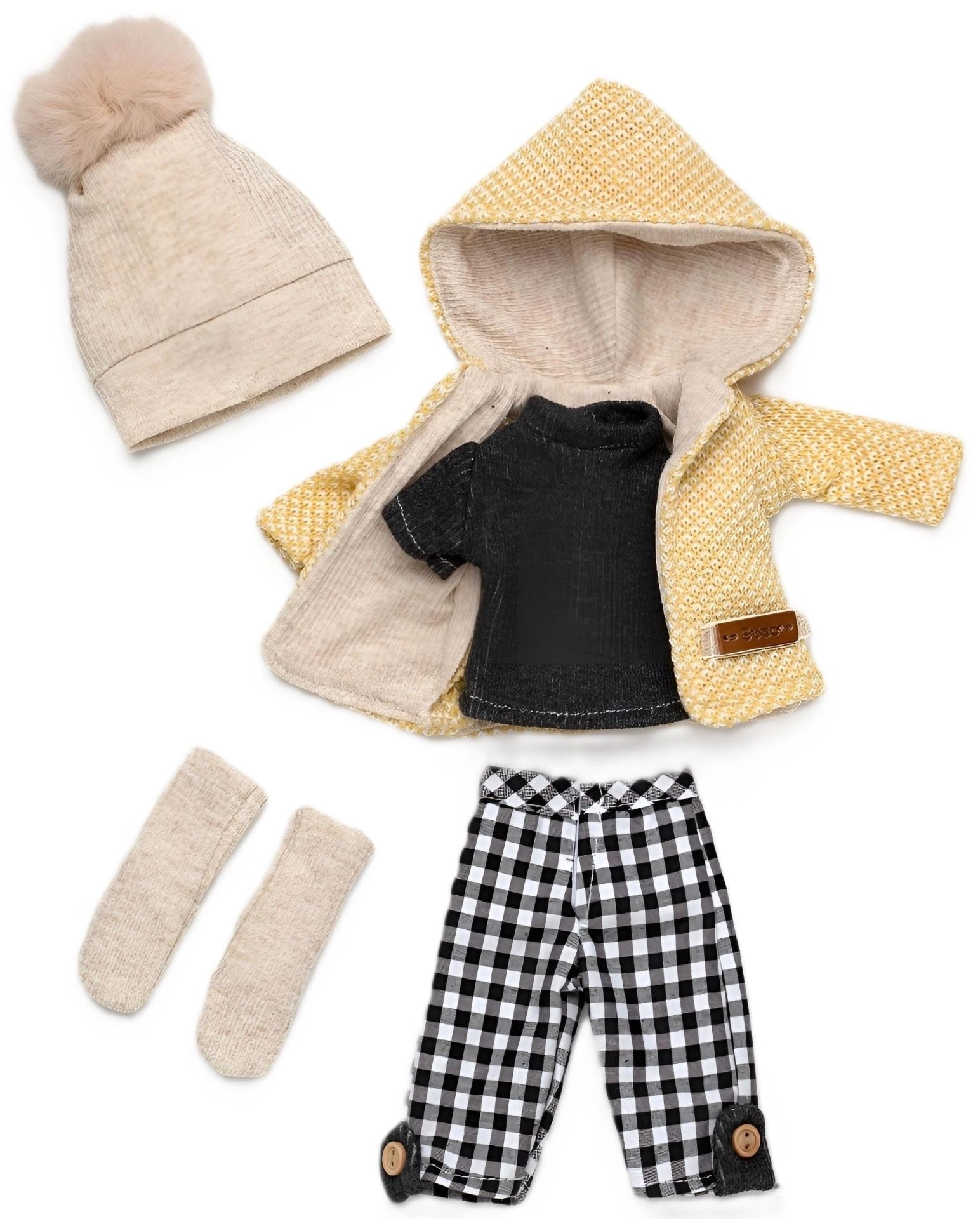 Arricchisci il guardaroba della tua bambola Penelope con una collezione coordinata in 5 pezzi che combina un moderno motivo a quadri con calde maglie. Il set include una giacca gialla con cappuccio con morbida fodera, un berretto lavorato a maglia con pompon, una maglietta nera, pantaloni a quadri con dettagli di bottoni e calzini/scaldamuscoli lavorati a maglia. Tutto è pensato per essere facile da mettere e togliere.