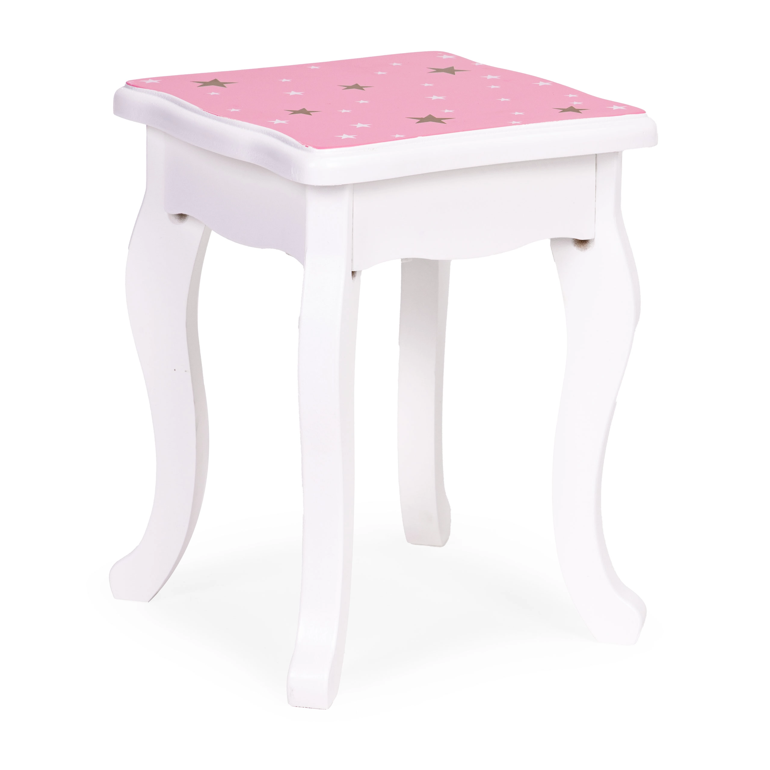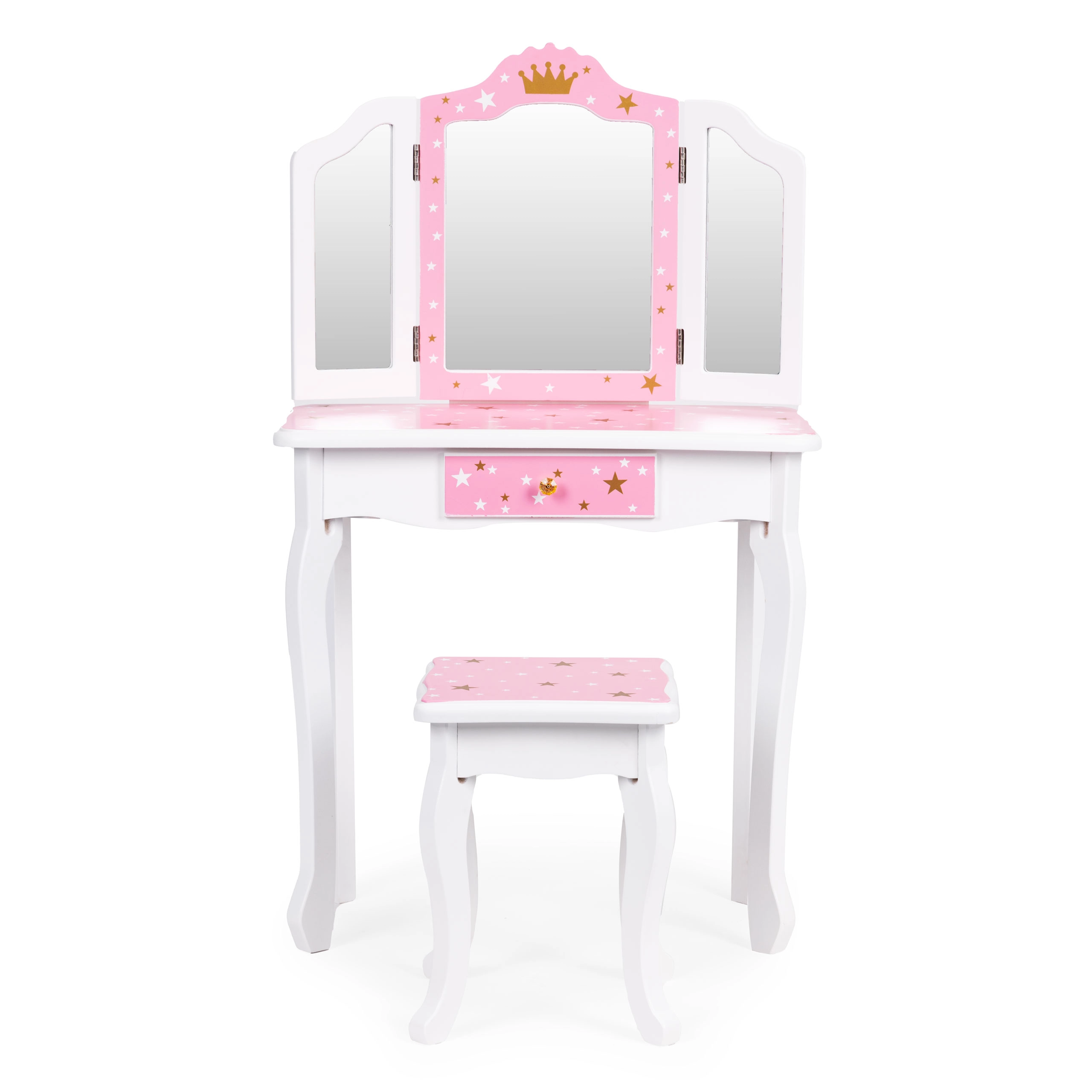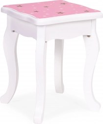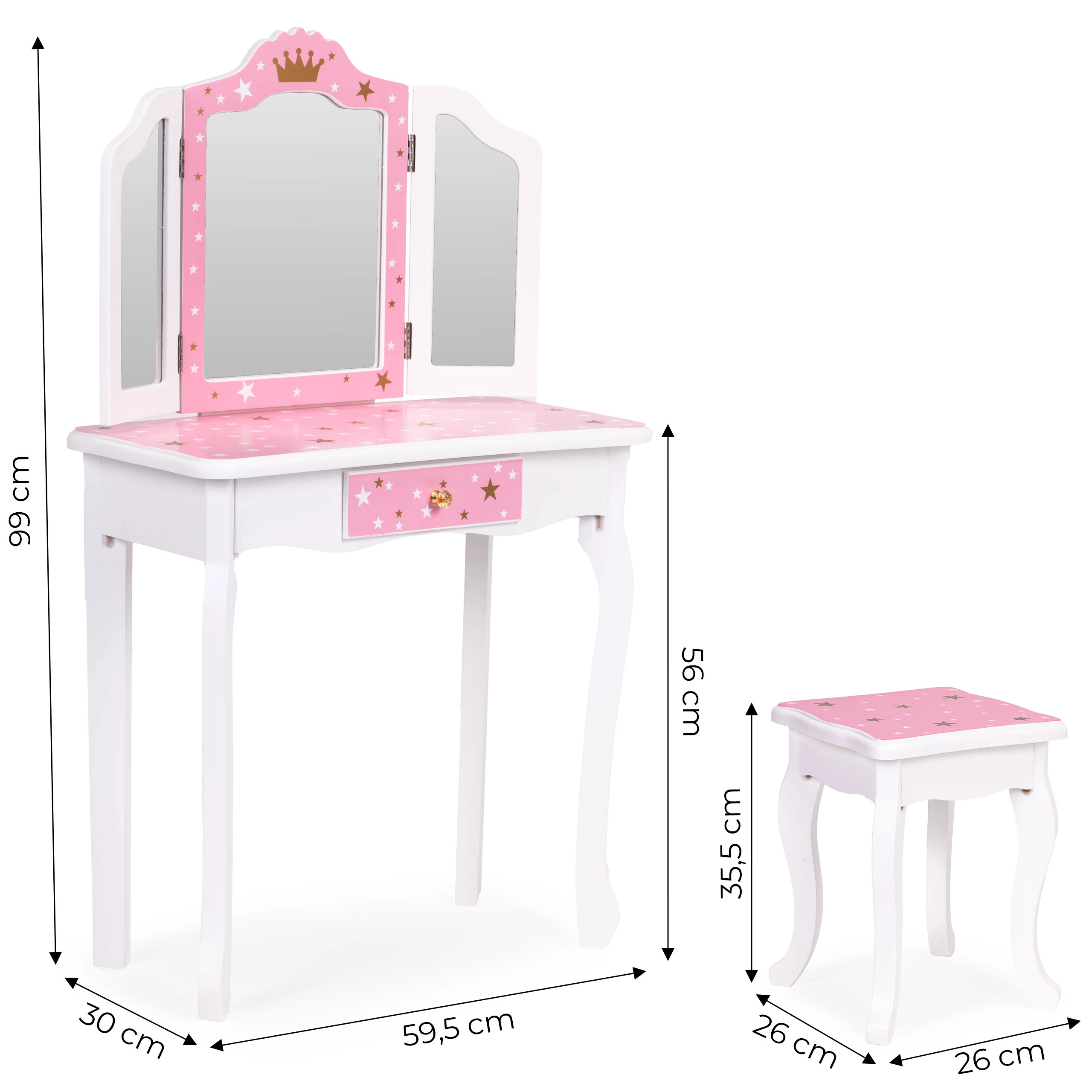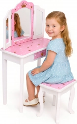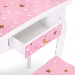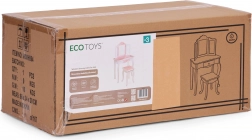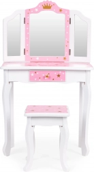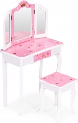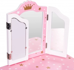 Crea un angolo bellezza incantato nella cameretta. Il tavolino da toeletta ECOTOYS unisce funzionalità e design fiabesco: il grande specchio centrale è affiancato da due ante laterali richiudibili per guardarsi da diverse angolazioni, mentre il pratico cassetto custodisce mollette, elastici e accessori per bambini. Il set è completato da un sgabello stabile abbinato al design.