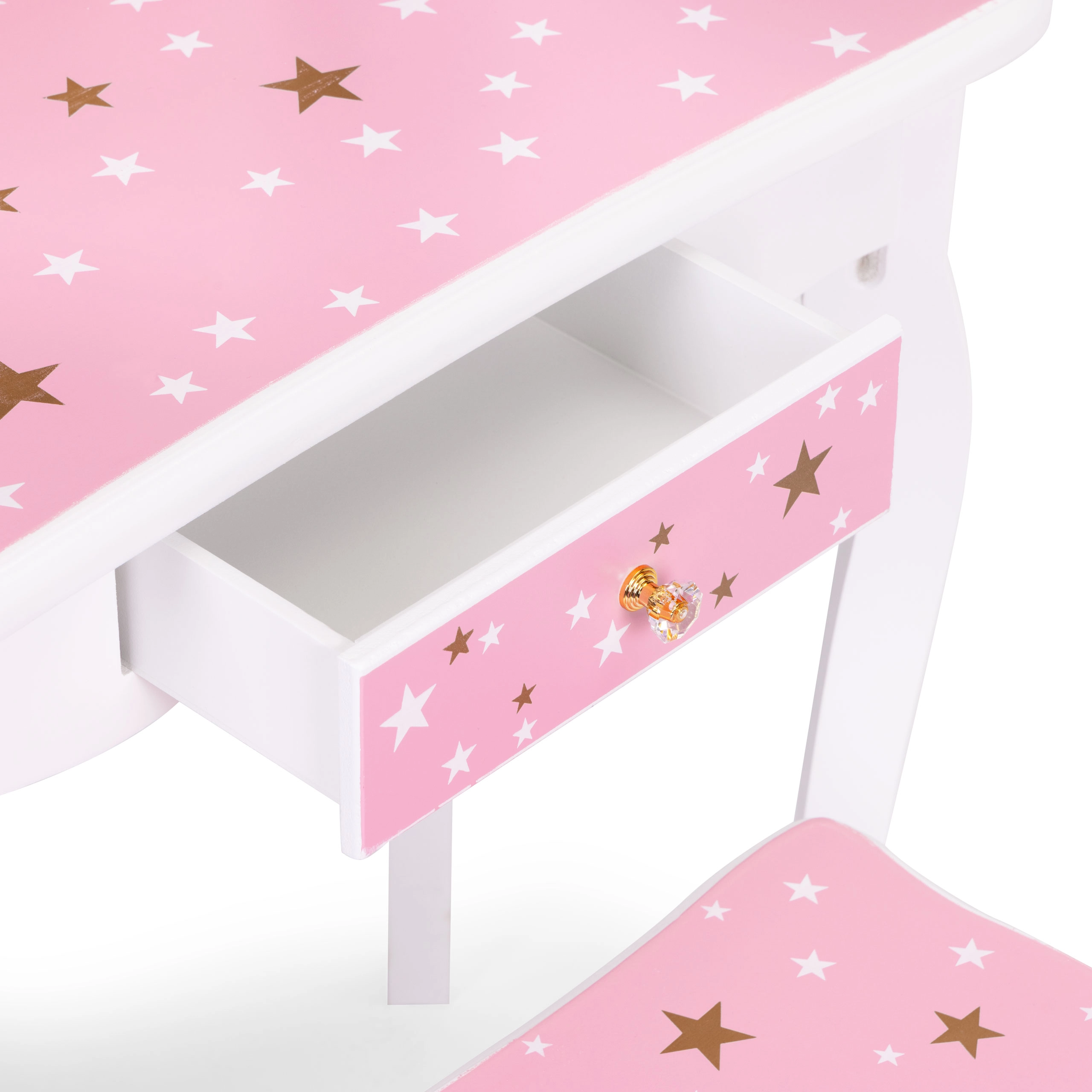 Grazie al legno di qualità e all’MDF, il tavolino è robusto e resistente. Favorisce la motricità fine, la coordinazione occhio‑mano e l’autonomia durante il gioco quotidiano “salone di bellezza” o “principessa”. Il delicato rosa con motivi di stelline e coroncina si adatta alla maggior parte degli interni.