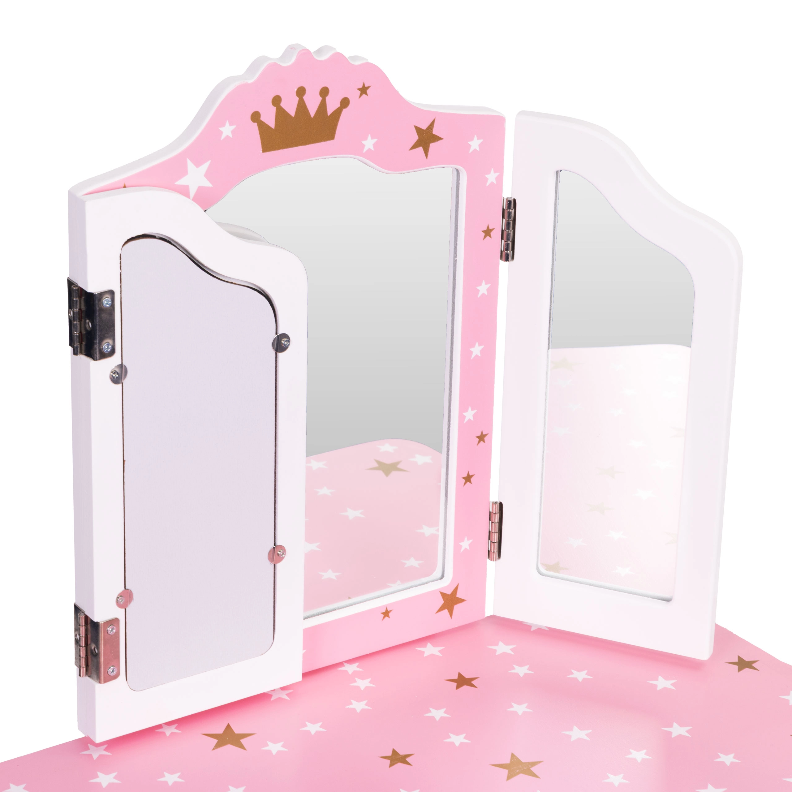 Il grande specchio centrale e le due ante laterali richiudibili permettono ai bambini di vedersi da più angolazioni, aumentando il realismo del gioco.