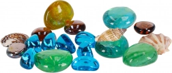 Nel blocco troverai ciottoli lisci e lucenti in tonalità di blu, verde e ambra, oltre a piccole conchiglie. Ogni pezzo è unico.