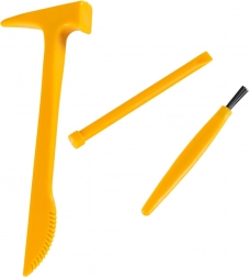 Strumenti leggeri in plastica adatti alle mani dei bambini per scavare e pulire i reperti in modo comodo e sicuro.