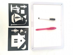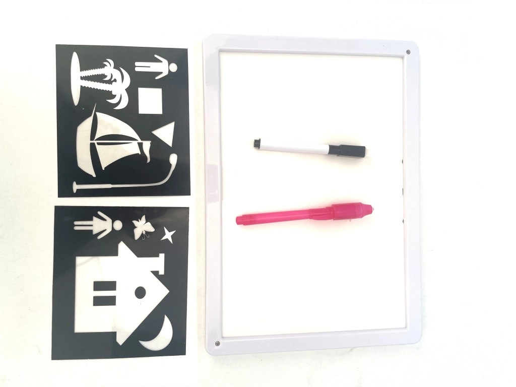 Scopri il divertimento senza disordine con uno strumento creativo per bambini dai 3 anni. Questa leggera lavagna da disegno in formato A4 consente di disegnare con una speciale penna luminosa e creare magiche immagini che brillano al buio. Grazie alla struttura bifacciale offre un doppio utilizzo – disegno luminoso e normale disegno su superficie bianca. Nella confezione trovi 2 penne, stencil di forme e batterie LR44 per un uso immediato.