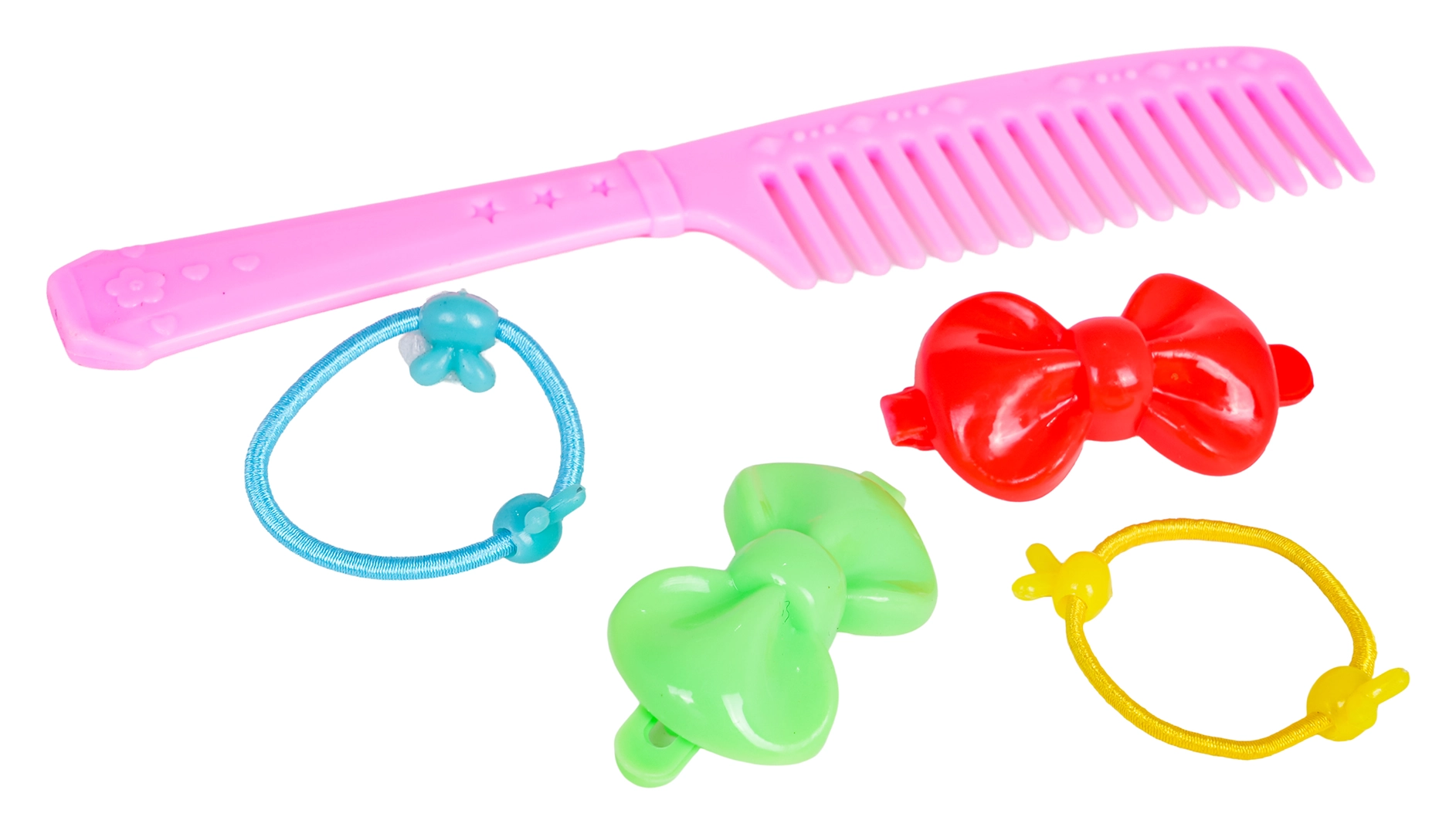 Il pettine, due mollettine e due elastici permettono di pettinare, decorare e cambiare il look della bambola secondo la fantasia del bambino.