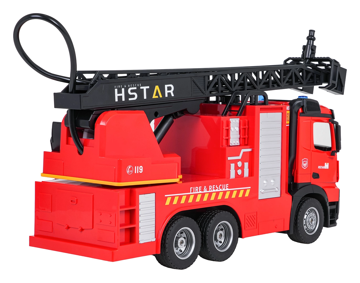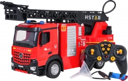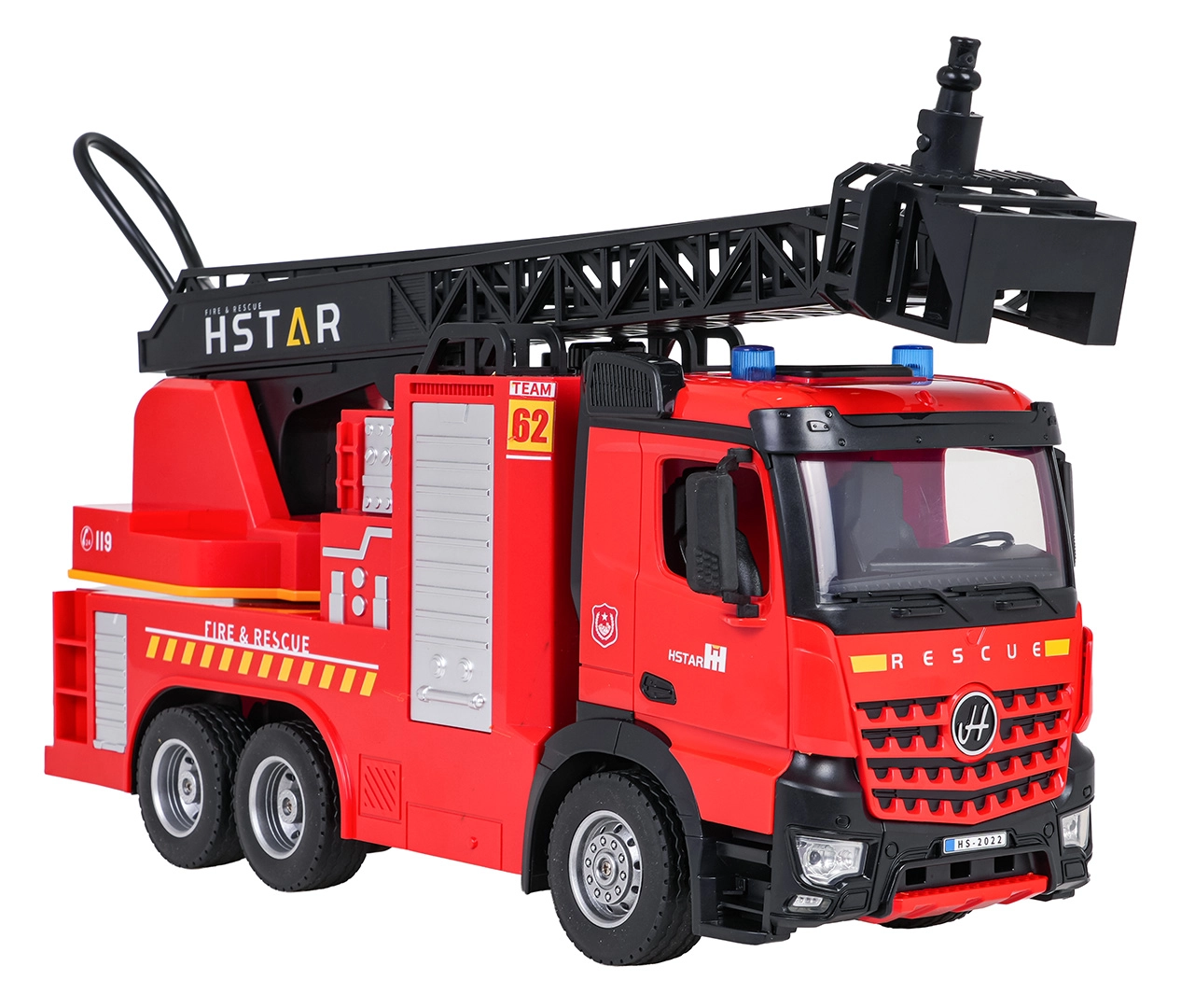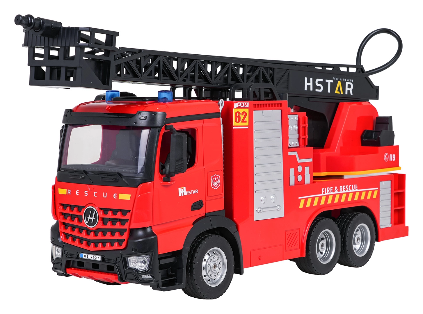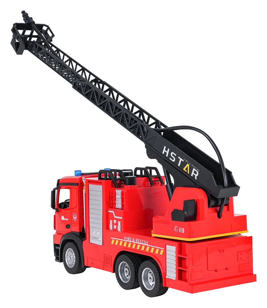 Grande camion dei pompieri a specchio controllato per bambini dai 6 anni con scala estensibile e girevole, spruzzo d’acqua, controllo a 2,4 GHz e effetti luminosi e sonori. Struttura robusta, pneumatici in gomma e dettagli realistici per ore di divertimento d’azione in casa e all’aperto.
