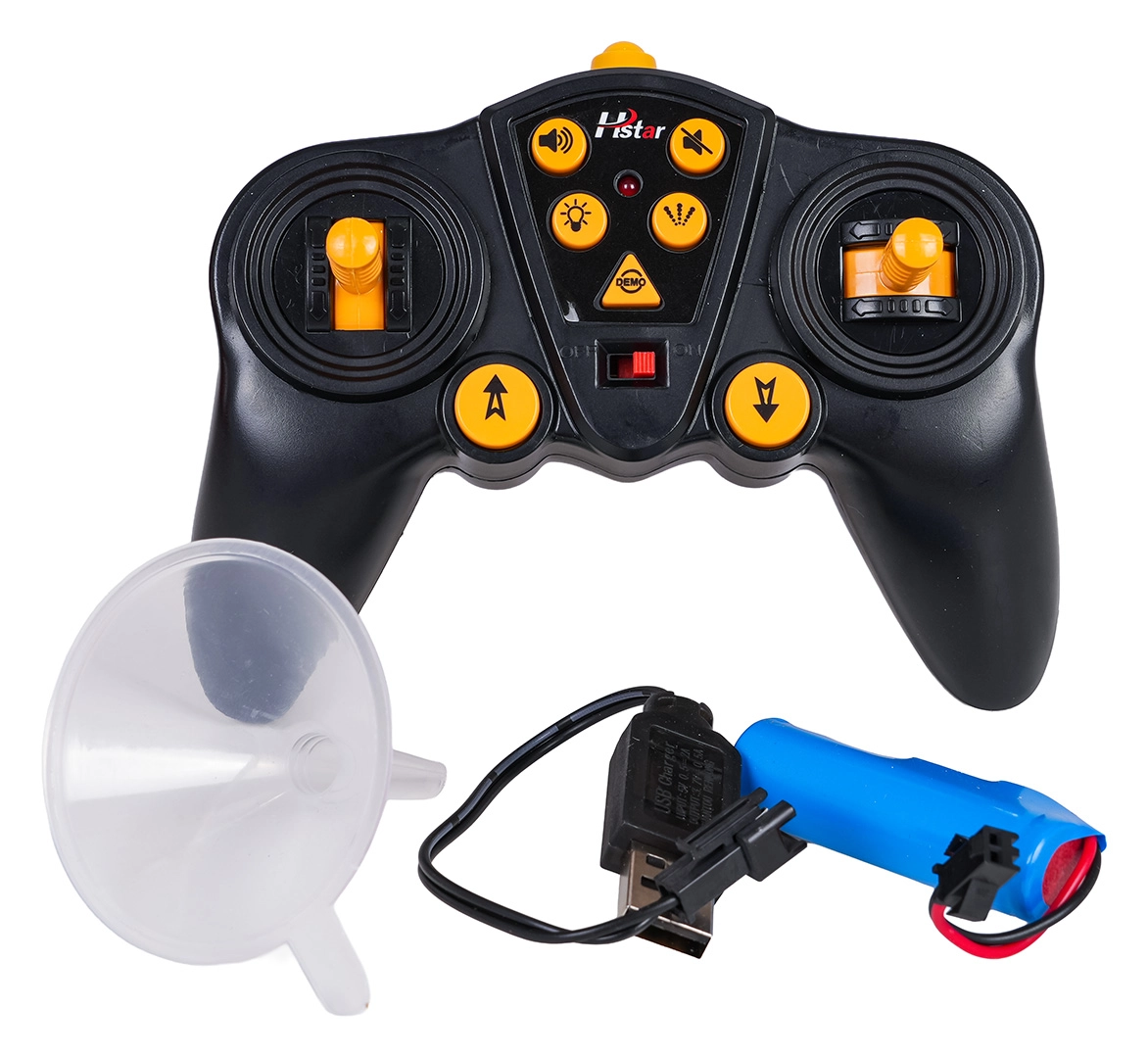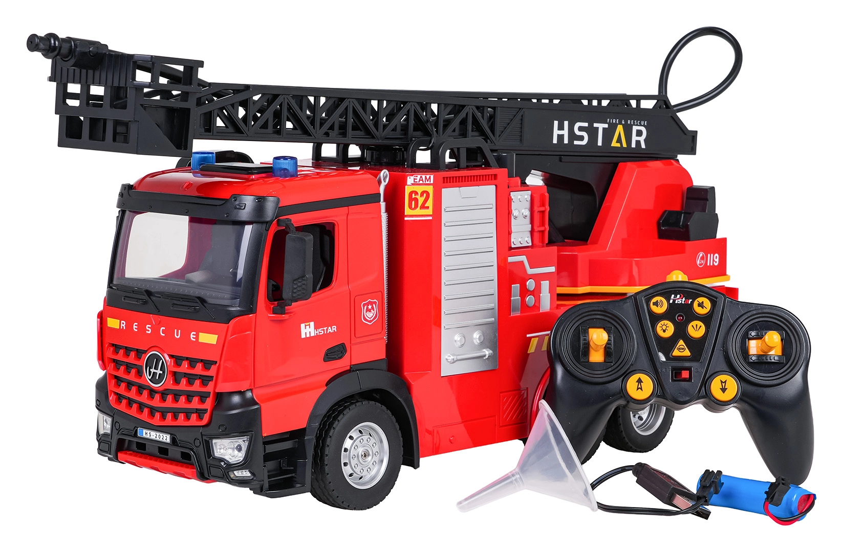 - Camion dei pompieri, radiocomando 2,4 GHz, batteria 3,7 V, cavo di ricarica USB, pipetta per l’acqua