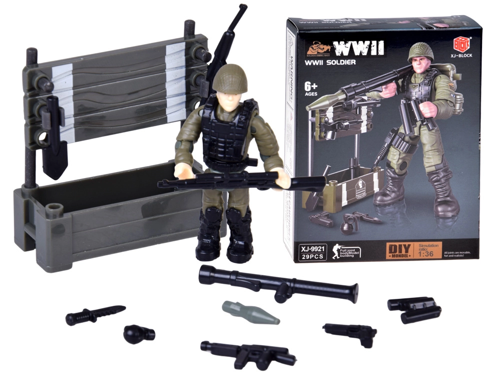 Assembla una minifigure realistica di un soldato dell’Seconda Guerra Mondiale composta da 28 pezzi. Il kit è perfetto per appassionati di militaria, storia e costruzioni. La figura finita ha arti snodabili, testa e busto rotanti e, grazie alla lavorazione dettagliata, appare fedele e autentica. Inclusi anche accessori come cassa, armi e granate.