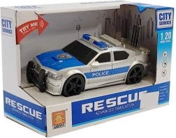 L'auto della polizia color argento in scala 1:20 farà felici i piccoli amanti dell'azione. Grazie agli effetti luminosi e sonori, ai tre pulsanti sul tetto e al meccanismo a frizione, i bambini vivranno un gioco realistico d'intervento. Nella confezione sono incluse le batterie; non manca il bagagliaio posteriore apribile e la certificazione CE di sicurezza.