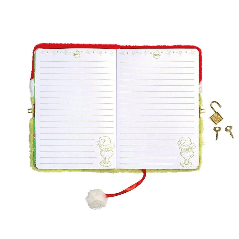 Concediti un quaderno stiloso con copertina in peluche e il motivo accattivante del GRINCH. Grazie al formato A5 entra comodamente nello zaino o nella borsa, così puoi averlo sempre a portata di mano. Il lucchetto con due chiavi protegge i tuoi appunti, il diario e gli schizzi.