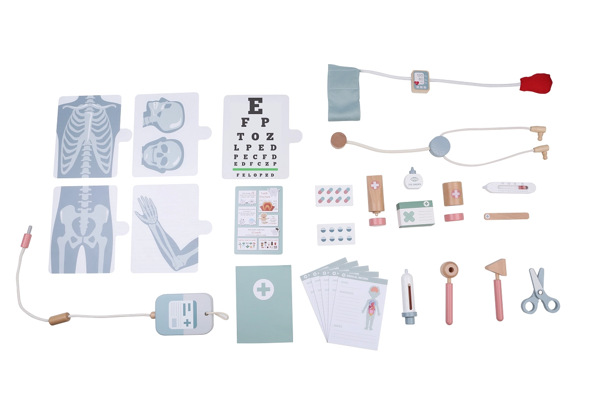 Questo set di role play stimola immaginazione, interazione sociale e aiuta a ridurre la paura della visita dal medico. Gli strumenti realistici in legno di qualità e altri materiali insegnano ai bambini a riconoscere gli strumenti medici, pianificare gli esami e prendersi cura dei “pazienti”.