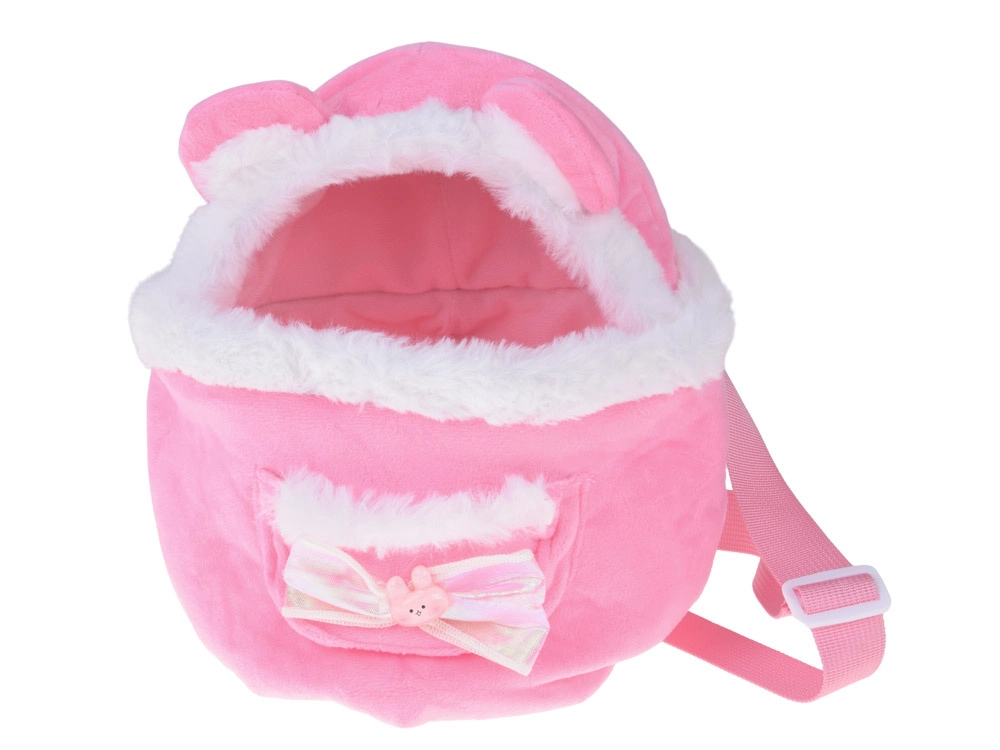 Dolcissimo zainetto con orecchiette, bordo morbido e taschina. Gli spallacci regolabili assicurano un trasporto confortevole e spazio per la bottiglietta e gli accessori.