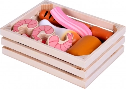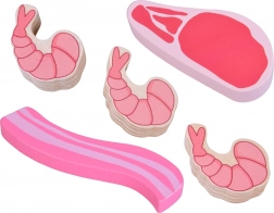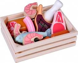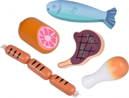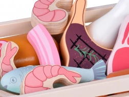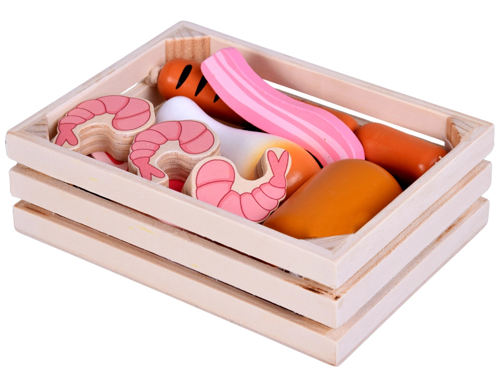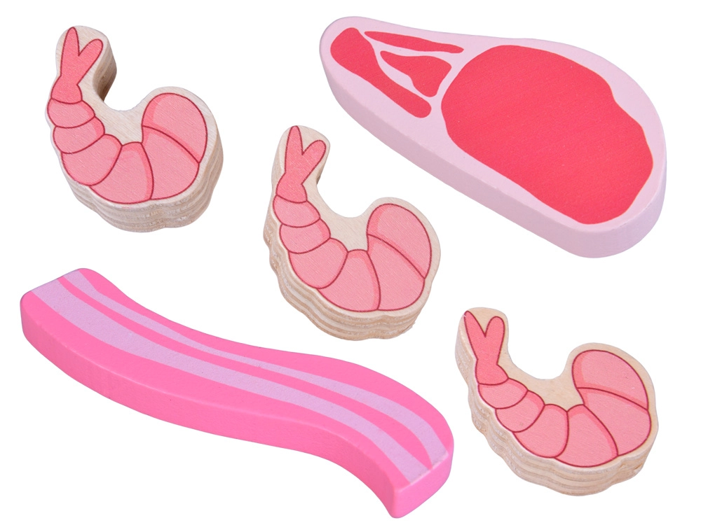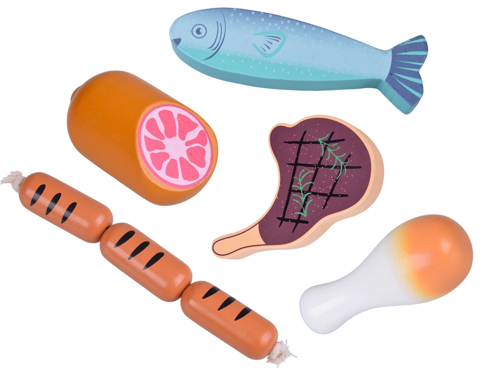 Questo set di alimenti in legno include tutto ciò che i bambini conoscono dalla cucina o dal negozio: wurstel, salame, pancetta, bistecche, pezzi di pollo, pesce e gamberi. I pezzi sono solidi, piacevolmente arrotondati e dipinti con dettagli per risultare realistici e al contempo completamente sicuri per il gioco.