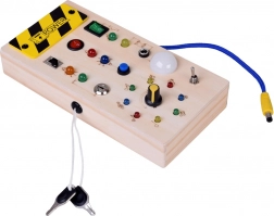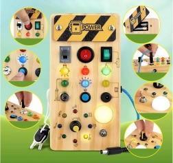 Questa tavola attività in legno, curata nei dettagli, offre un’ampia varietà di stimoli: dall’azionamento degli interruttori alla pressione dei pulsanti, fino alla rotazione della manopola e al collegamento del cavo. A ogni azione il bambino vede una risposta immediata sotto forma di luce, favorendo in modo naturale apprendimento e concentrazione. Le dimensioni compatte la rendono una compagna ideale di viaggio – in auto, aereo, treno, al ristorante o in sala d’attesa.