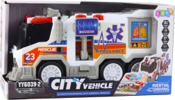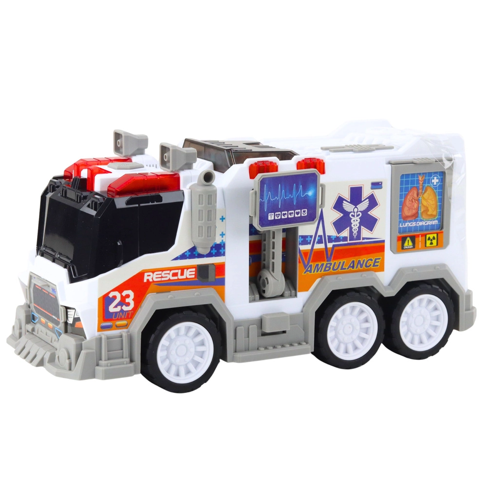 Questa ambulanza curata nei dettagli conquisterà i bambini con la classica combinazione bianco‑rosso con elementi blu e vistose grafiche mediche. Premendo i pulsanti si attivano sirenes e effetti luminosi, che rendono gli scenari di soccorso ancora più realistici.